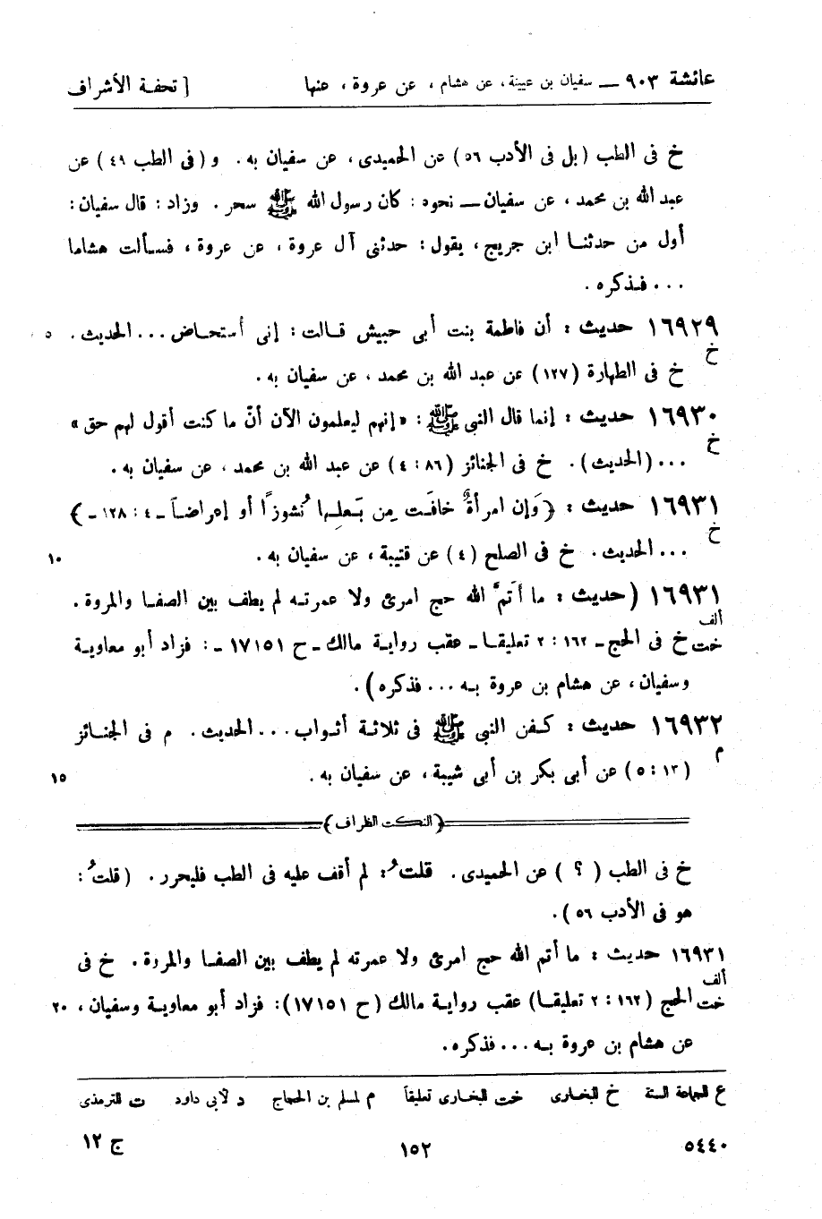(ألف خت خ) (حديث: ما أتَمَّ الله حج امرئ ولا عمرته لم يطف بين الصفا والمروة. في الحج - 162: 2 تعليقاً - عقب رواية مالك - (ح 17151) -: فزاد أبو معاوية وسفيان، عن هشام بن عروة به ... فذكره) .