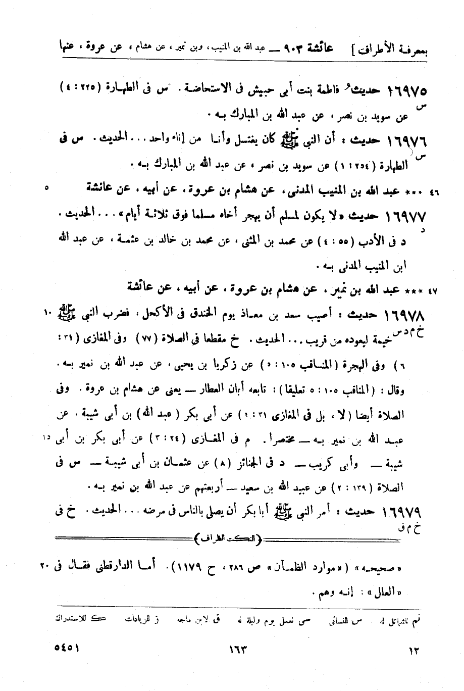 خ مقطعاً في الصلاة (77) وفي المغازي (31: 6) وفي الهجرة (المناقب 105: 5) عن زكريا بن يحيى، عن عبد الله بن نمير به. وقال: (المناقب 105: 5 تعليقاً) : تابعه أبان العطار - يعني عن هشام بن عروة. وفي الصلاة أيضاً (لا، بل في المغازي 31: 1) عن أبي بكر (عبد الله) بن أبي شيبة، عن عبد الله بن نمير به - مختصراً.