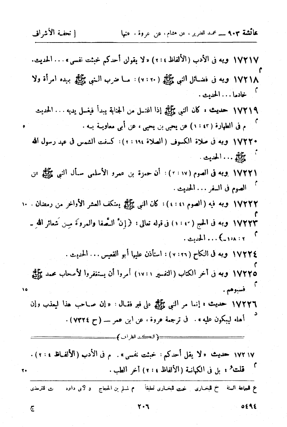 17218 - وبه في فضائل النبي صَلَّى اللَّهُ عَلَيْهِ وَسَلَّمَ (20: 7) : ما ضرب النبي صَلَّى اللَّهُ عَلَيْهِ وَسَلَّمَ بيده امرأة ولا خادماً ... الحديث.