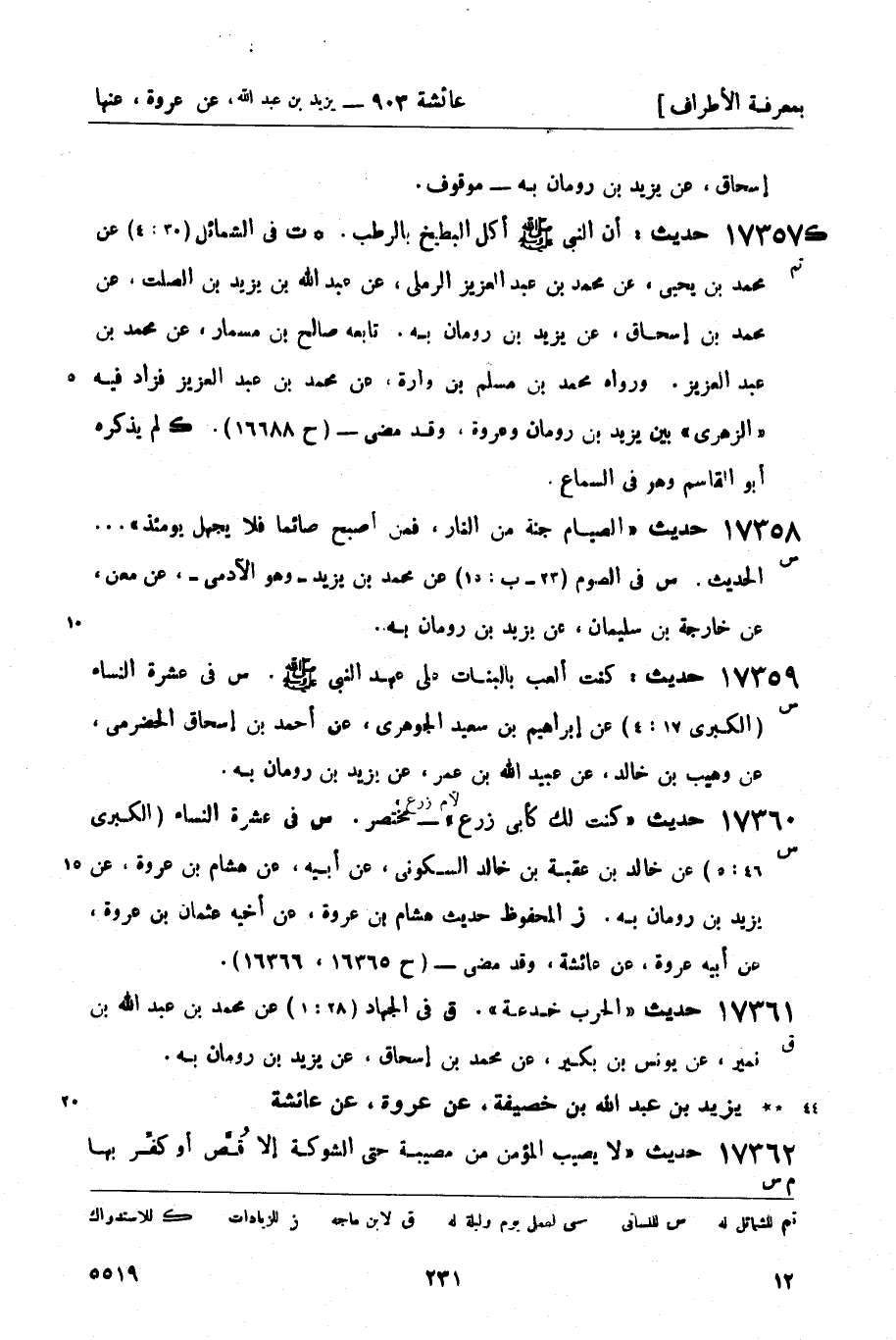ت في الشمائل (30: 4) عن محمد بن يحيى، عن محمد بن عبد العزيز الرملي، عن عبد الله بن يزيد بن الصلت، عن محمد بن إسحاق، عن يزيد بن رومان به. تابعه صالح بن مسمار، عن محمد بن عبد العزيز. ورواه محمد بن مسلم بن وارة، عن محمد بن عبد العزيز فزاد فيه الزهري بين يزيد بن رومان وعروة، وقد مضى - (ح 16688) . (ك) لم يذكره أبو القاسم وهو في السماع.