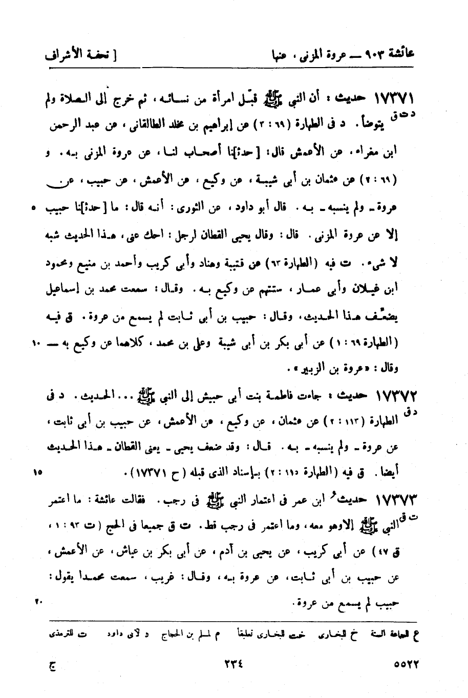 ت فيه (الطهارة 63) عن قتيبة وهناد وأبي كريب وأحمد بن منيع ومحمود بن غيلان وأبي عمار، ستتهم عن وكيع به. وقال: سمعت محمد بن إسماعيل يضعِّف هذا الحديث، وقال: حبيب بن أبي ثابت لم يسمع من عروة.