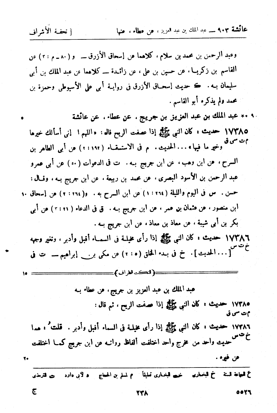 17385 - (م ت سى ق) حديث: كان النبي صَلَّى اللَّهُ عَلَيْهِ وَسَلَّمَ إذا عصفت الريح قال: اللهم! إني أسألك خيرها وخير ما فيها ... الحديث. (م) في الاستسقاء (192: 2) عن أبي الطاهر بن السرح، عن ابن وهب، عن ابن جريج به. (ت) في الدعوات (50) عن أبي عمرو عبد الرحمن بن الأسود البصري، عن محمد بن ربيعة، عن ابن جريج به، وقال: حسن. (س) في اليوم والليلة (264: 1) عن ابن السرح به. و (264: 2) عن إسحاق بن منصور، عن عثمان بن عمر، عن ابن جريج به. (ق) في الدعاء (21: 3) عن أبي بكر بن أبي شيبة، عن معاذ بن معاذ، عن ابن جريج به.