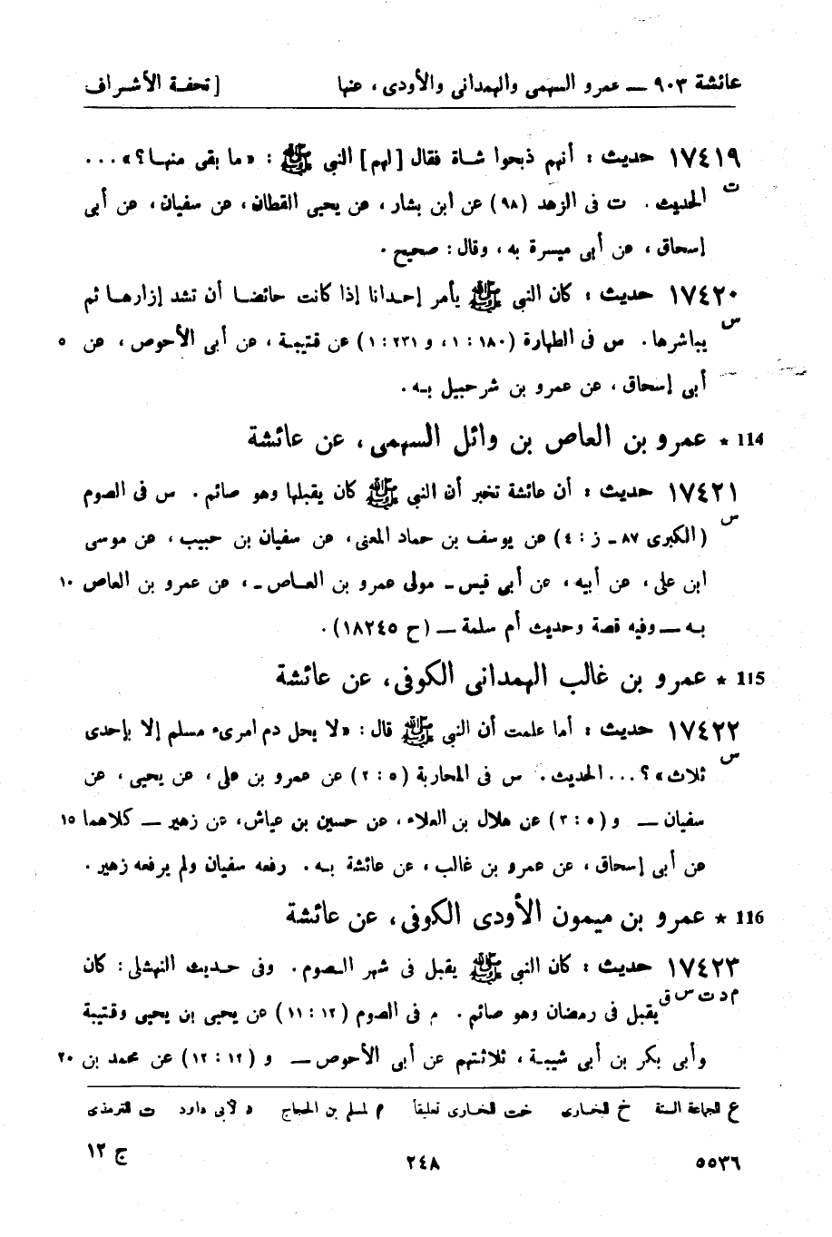 س في المحاربة (5: 2) عن عمرو بن علي، عن يحيى، عن سفيان - و (5: 3) عن هلال بن العلاء، عن حسين بن عياش، عن زهير - كلاهما عن أبي إسحاق، عن عمرو بن غالب، عن عائشة به. رفعه سفيان ولم يرفعه زهير.