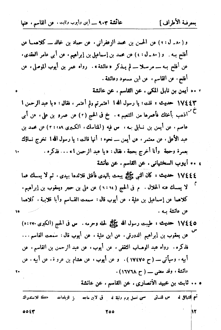 س فيه (المناسك، الكبرى 289: 3) عن محمد بن عبد الأعلى، عن معتمر، عن أيمن - نحوه: أنها قالت: يا رسول الله! تخرج نساؤك بعمرة وحجة وأنا أخرج بحجة، فقال: يا عبد الرحمن!.... فذكره.