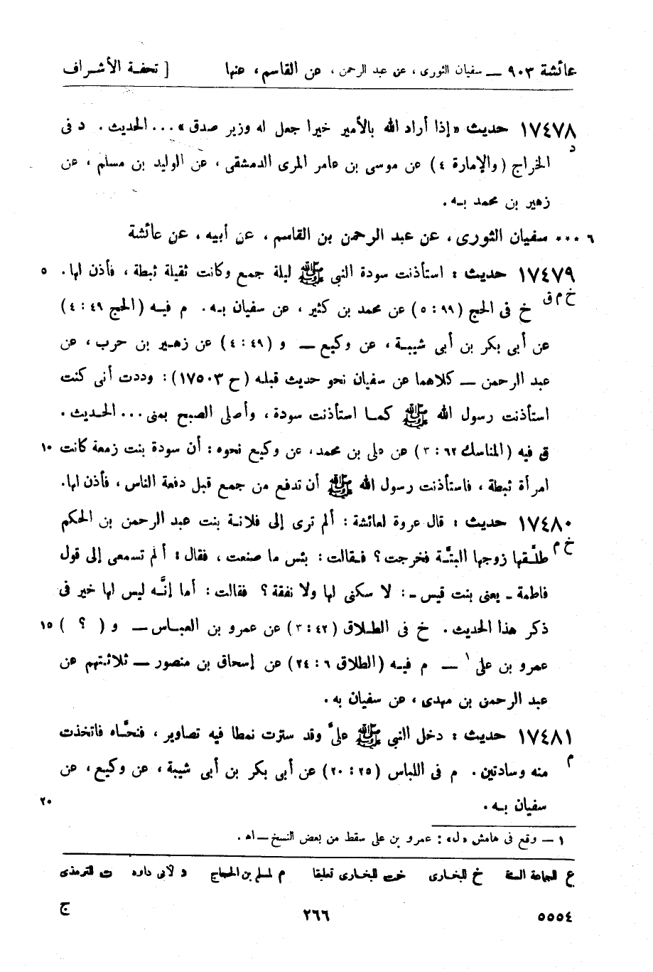 17479 -[خ م ق] حديث: استأذنت سودة النبي صَلَّى اللَّهُ عَلَيْهِ وَسَلَّمَ ليلة جمع وكانت ثقيلة ثبطة، فأذن لها. خ في الحج (99: 5) عن محمد بن كثير، عن سفيان به. م فيه (الحج 49: 4) عن أبي بكر بن أبي شيبة، عن وكيع - و (49: 4) عن زهير بن حرب، عن عبد الرحمن - كلاهما عن سفيان نحو حديث قبله (ح 17503) : وددت أني كنت استأذنت رسول الله صَلَّى اللَّهُ عَلَيْهِ وَسَلَّمَ كما استأذنت سودة، وأصلي الصبح بمنى ... الحديث. ق فيه (المناسك 62: 3) عن علي بن محمد، عن وكيع نحوه: أن سودة بنت زمعة كانت امرأة ثبطة، فاستأذنت رسول الله صَلَّى اللَّهُ عَلَيْهِ وَسَلَّمَ أن تدفع من جمع قبل دفعة الناس، فأذن لها.