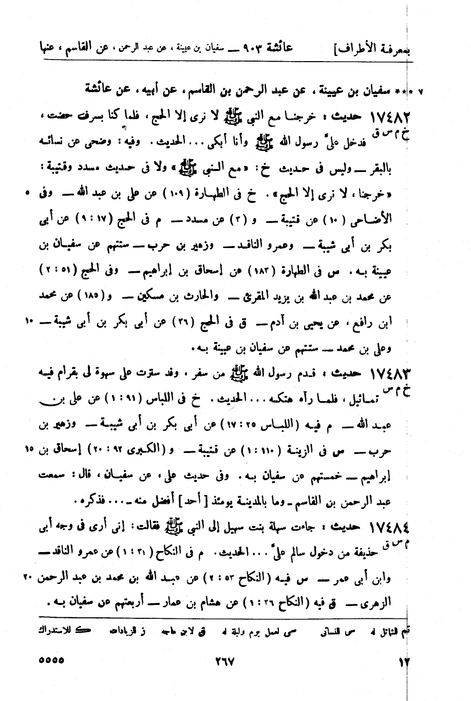 17483 -[خ م س] حديث: قدم رسول الله صَلَّى اللَّهُ عَلَيْهِ وَسَلَّمَ من سفر، وقد سترت على سهوة لي بقرام فيه تماثيل، فلما رآه هتكه ... الحديث. خ في اللباس (91: 1) عن علي بن عبد الله - م فيه (اللباس 25: 17) عن أبي بكر بن أبي شيبة - وزهير بن حرب - س في الزينة (110: 1) عن قتيبة - و (الكبرى 92: 20) إسحاق بن إبراهيم - خمستهم عن سفيان به. وفي حديث علي، عن سفيان، قال: سمعت عبد الرحمن بن القاسم - وما بالمدينة يومئذ [أحد] أفضل منه ... فذكره.