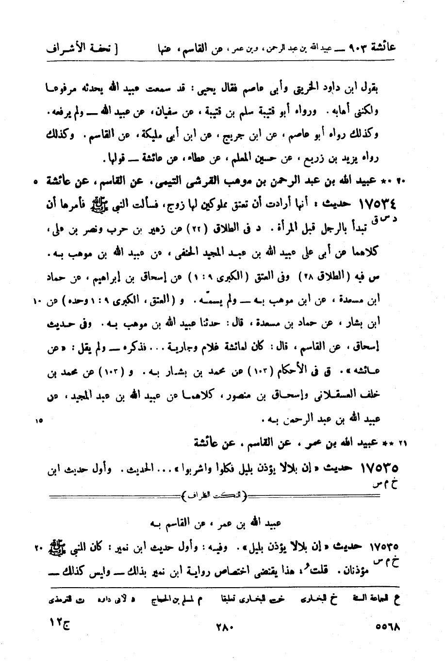 17534 -[د س ق] حديث: أنها أرادت أن تعتق مملوكين لها زوج، فسألت النبي صَلَّى اللَّهُ عَلَيْهِ وَسَلَّمَ فأمرها أن تبدأ بالرجل قبل المرأة. د في الطلاق (22) عن زهير بن حرب ونصر بن علي، كلاهما عن أبي علي عبيد الله بن عبد المجيد الحنفي، عن عبيد الله بن موهب به. س فيه (الطلاق 28) وفي العتق (الكبرى 9: 1) عن إسحاق بن إبراهيم، عن حماد بن مسعدة، عن ابن موهب به - ولم يسمه. و (العتق، الكبرى 9: 1 وحده) عن ابن بشار، عن حماد بن مسعدة، قال: حدثنا عبيد الله بن موهب به. وفي حديث إسحاق، عن القاسم، قال: كان لعائشة غلام وجارية ... فذكره - ولم يقل: عن عائشة. ق في الأحكام (103) عن محمد بن بشار به. و (103) عن محمد بن خلف العسقلاني وإسحاق بن منصور، كلاهما عن عبيد الله بن عبد المجيد، عن عبيد الله بن عبد الرحمن به.