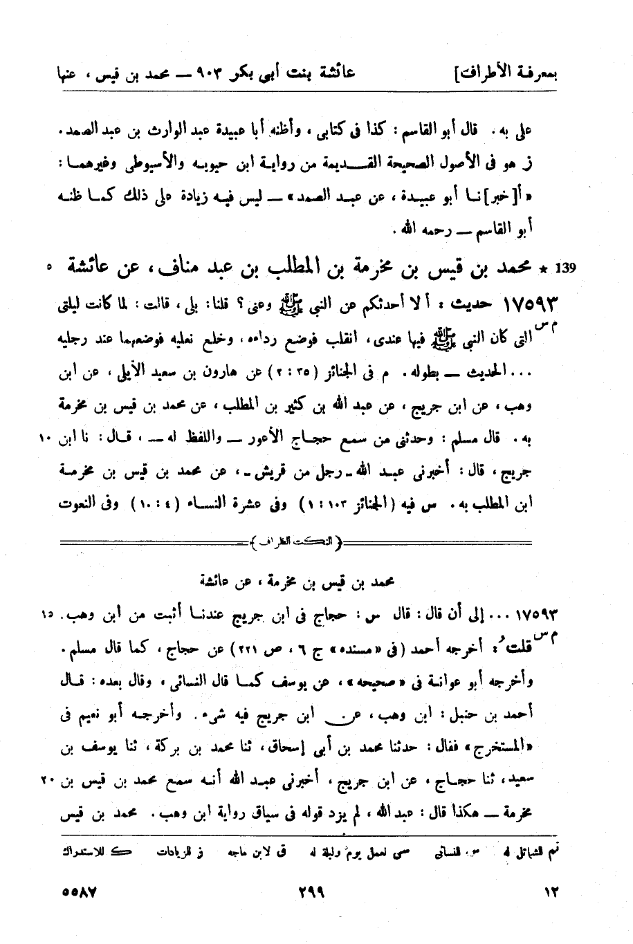 17593 -[م س] حديث: ألا أحدثكم عن النبي صَلَّى اللَّهُ عَلَيْهِ وَسَلَّمَ وعني؟ قلنا: بلى، قالت: لما كانت ليلتي التي كان النبي صَلَّى اللَّهُ عَلَيْهِ وَسَلَّمَ فيها عندي، انقلب فوضع رداءه، وخلع نعليه فوضعهما عند رجليه ... الحديث - بطوله. م في الجنائز (35: 2) عن هارون بن سعيد الأيلي، عن ابن وهب، عن ابن جريج، عن عبد الله بن كثير بن المطلب، عن محمد بن قيس بن مخرمة به. قال مسلم: وحدثني من سمع حجاج الأعور - واللفظ له -، قال: نا ابن جريج، قال: أخبرني عبد الله - رجل من قريش -، عن محمد بن قيس بن مخرمة بن المطلب به. س فيه (الجنائز 103: 1) وفي عشرة النساء (4: 10) وفي النعوت -[300]- (الكبرى 15: 1) عن يوسف بن سعيد، عن حجاج بن محمد، عن ابن جريج، عن عبد الله بن أبي مليكة أنه سمع محمد بن قيس بن مخرمة ... فذكره. و (الجنائز؟، وعشرة النساء 4: 9، والنعوت، الكبرى 15: 2) عن سليمان بن داود، عن ابن وهب، عن ابن جريج، عن عبد الله بن كثير، عن محمد بن قيس بن مخرمة به. قال النسائي: حجاج في ابن جريج أثبت عندنا من ابن وهب. رواه روح بن عبادة، عن ابن جريج، قال: أخبرني من سمع محمد بن قيس بن مخرمة - ولم يسم من أخبره. ورواه ابن جريج أيضاً عن عطاء، عن ابن أبي مليكة، عن عائشة، وقد مضى - (ح 16256) .