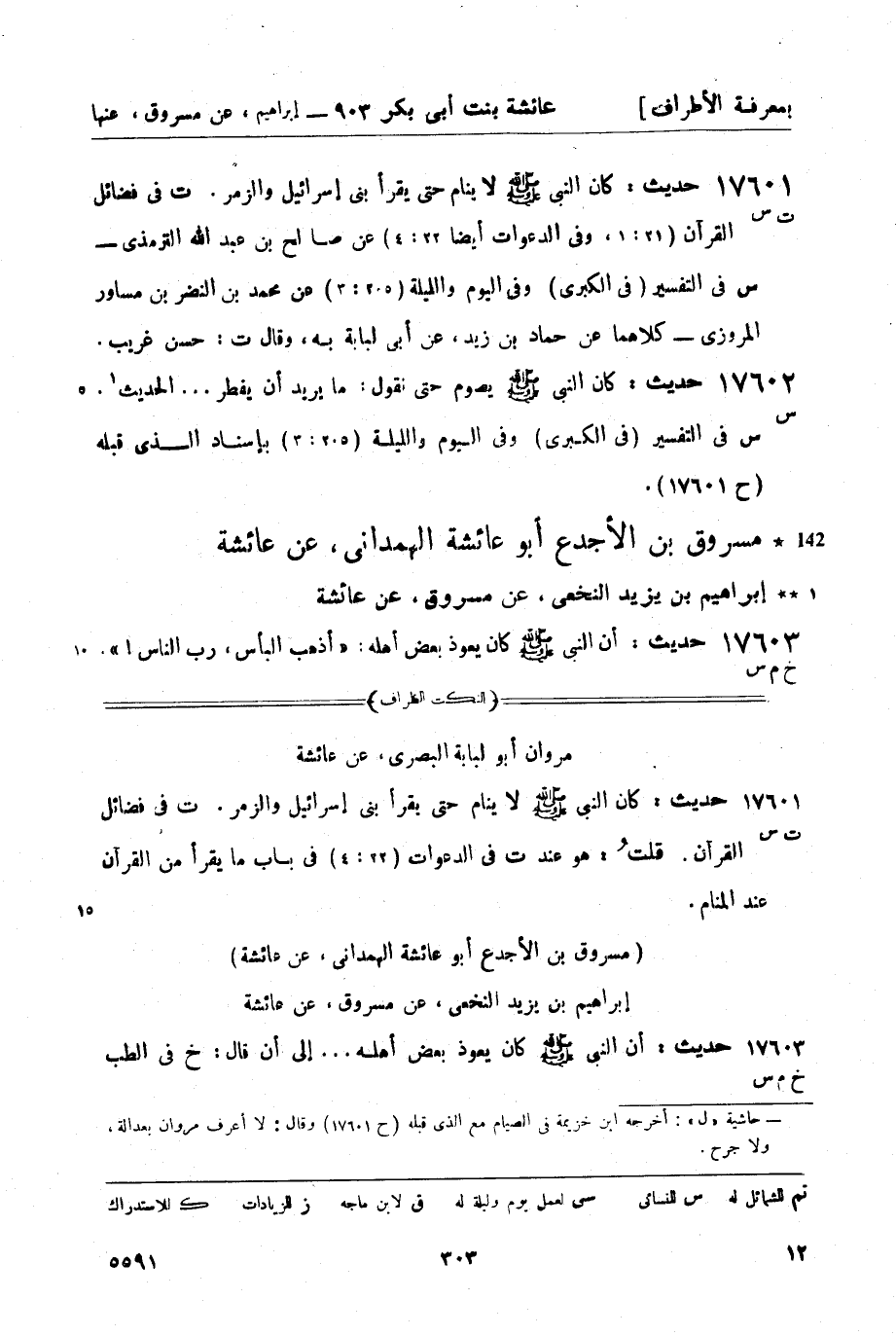 17603 -[خ م س] حديث: أن النبي صَلَّى اللَّهُ عَلَيْهِ وَسَلَّمَ كان يعوذ بعض أهله: اذهب البأس، رب الناس!. -[304]- خ في الطب (بل في المرضى 20) عن موسى بن إسماعيل، عن أبي عوانة، عن منصور، عن إبراهيم به. و (الطب 40) عن عبد الله بن أبي شيبة؛ و (38: 2) عن عمرو بن علي - فرقهما -؛ كلاهما عن يحيى بن سعيد، عن سفيان، عن الأعمش، عن أبي الضحى مسلم بن صبيح، عن مسروق به. قال سفيان: فذكرته لمنصور فحدثني عن إبراهيم نحوه. قال خ (المرضى 20 تعليقاً) : وقال عمرو بن أبي قيس وإبراهيم، عن منصور، عن إبراهيم وأبي الضحى، عن مسروق به. وقال جرير: عن منصور، عن أبي الضحى وحده. م فيه (الطب 4: 3) عن شيبان بن فروخ، عن أبي عوانة به. و (4: 2) عن أبي بكر بن أبي شيبة وأبي بكر بن خلاد، كلاهما عن يحيى بن سعيد به. و (4: 2) عن بشر بن خالد، عن غندر؛ و (4: 3) عن محمد بن بشار، عن ابن أبي عدي؛ كلاهما عن شعبة - و (4: 2) عن أبي بكر بن أبي شيبة وأبي كريب، كلاهما عن أبي معاوية - و (4: 2) عن يحيى بن يحيى، عن هشيم - و (4: 1) عن زهير بن حرب وإسحاق بن إبراهيم، كلاهما عن جرير - أربعتهم عن الأعمش به. و (4: 4) عن أبي بكر بن أبي شيبة وزهير بن حرب، كلاهما عن جرير، عن منصور به. و (4: 5) عن القاسم بن زكريا، عن عبيد الله بن موسى، عن إسرائيل، -[305]- عن منصور، عن إبراهيم وأبي الضحى، كلاهما عن مسروق به. ك س فيه (الطب، الكبرى 20: 2) وفي اليوم والليلة (285 - ألف: 1) عن محمد بن قدامة، عن جرير، عن منصور به. و (اليوم والليلة 285 - ألف: 2، الطب الكبرى 20: 3) عن إبراهيم بن يعقوب، عن أبي النعمان، عن أبي عوانة به. و (اليوم والليلة 287: 1، الطب الكبرى؟) عن عمران بن موسى، عن عبد الواحد بن زياد، عن الأعمش به. و (اليوم والليلة 285 - ألف: 4، الطب الكبرى 20: 4) عن عبدة بن عبد الله، عن يحيى بن آدم، عن إسرائيل به. وفي اليوم والليلة وحده (285) عن عمرو بن علي به. و (285 - ألف: 4) عن أحمد بن سليمان والقاسم بن زكريا، كلاهما عن عبيد الله بن موسى به. و (285 - ألف: 3) عن عقبة بن قبيصة بن عقبة، عن أبيه، عن ورقاء، عن منصور، عن إبراهيم به. حديث ابي عوانة وسفيان وورقاء، عن منصور، عن إبراهيم وحده؛ وحديث جرير، عن منصور، عن أبي الضحى وحده؛ وحديث الآخرين، عن منصور، عنهما جميعاً. (ك الطب للنسائي ليس في الرواية ولم يذكره أبو القاسم) 1.