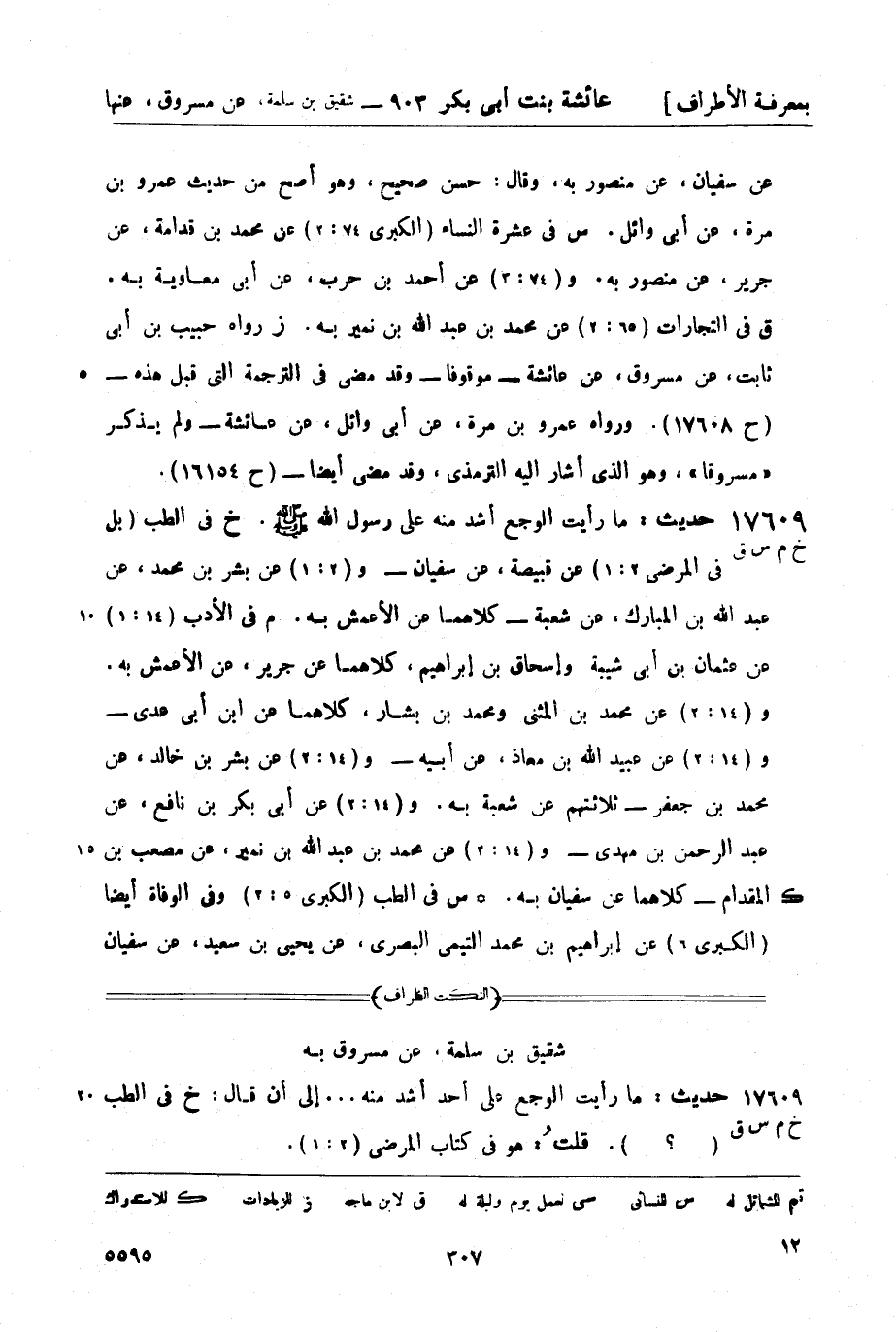 17609 -[خ م س ق] حديث: ما رأيت الوجع أشد منه على رسول الله صَلَّى اللَّهُ عَلَيْهِ وَسَلَّمَ. خ في الطب (بل في المرضى 2: 1) عن قبيصة، عن سفيان - و (2: 1) عن بشر بن محمد، عن عبد الله بن المبارك، عن شعبة - كلاهما عن الأعمش به. م في الأدب (14: 1) عن عثمان بن أبي شيبة، وإسحاق بن إبراهيم، كلاهما عن جرير، عن الأعمش به. و (14: 2) عن محمد بن المثنى، ومحمد بن بشار، كلاهما عن ابن أبي عدي - و (14: 2) عن عبيد الله بن معاذ، عن أبيه - و (14: 2) عن بشر بن خالد، عن محمد بن جعفر - ثلاثتهم عن شعبة به. و (14: 2) عن أبي بكر بن نافع، عن عبد الرحمن بن مهدي - و (14: 2) عن محمد بن عبد الله بن نمير، عن مصعب بن المقدام - كلاهما عن سفيان به. ك س في الطب (الكبرى 5: 2) وفي الوفاة أيضاً (الكبرى 6) عن إبراهيم بن محمد التيمى البصري، عن يحيى بن سعيد، عن سفيان -[308]- به. ق في الجنائز (64: 5) عن محمد بن عبد الله بن نمير به. ك حديث س ليس في الرواية ولم يذكره أبو القاسم.