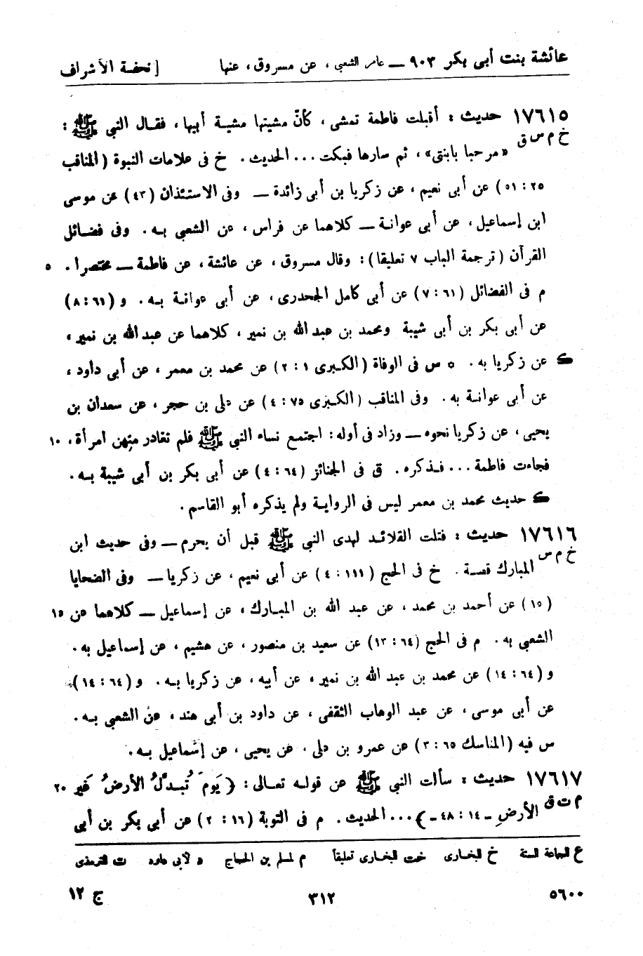 17615 -[خ م س ق] حديث: أقبلت فاطمة تمشي، كأنَّ مشيتها مشية أبيها، فقال النبي صَلَّى اللَّهُ عَلَيْهِ وَسَلَّمَ: مرحبا يا بنتي ثم سارها فبكت ... الحديث. خ في علامات النبوة (المناقب 25: 51) عن أبي نعيم، عن زكريا بن أبي زائدة - وفي الاستئذان (43) عن موسى بن إسماعيل، عن أبي عوانة - كلاهما عن فراس، عن الشعبي به. وفي فضائل القرآن (ترجمة الباب 7 تعليقاً) : وقال مسروق، عن عائشة، عن فاطمة - مختصراً. م في الفضائل (61: 7) عن أبي كامل الجحدري، عن أبي عوانة به. و (61: 8) عن أبي بكر بن أبي شيبة ومحمد بن عبد الله بن نمير، كلاهما عن عبد الله بن نمير، عن زكريا به. ك س في الوفاة (الكبرى 1: 2) عن محمد بن معمر، عن أبي داود، عن أبي عوانه به. وفي المناقب (الكبرى 75: 4) عن علي بن حجر، عن سعدان بن يحيى، عن زكريا نحوه - وزاد في أوله: اجتمع نساء النبي صَلَّى اللَّهُ عَلَيْهِ وَسَلَّمَ فلم تغادر منهن امرأة، فجاءت فاطمة ... فذكره. ق في الجنائز (64: 4) عن أبي بكر بن أبي شيبة به. ك حديث محمد بن معمر ليس في الرواية ولم يذكره أبو القاسم.