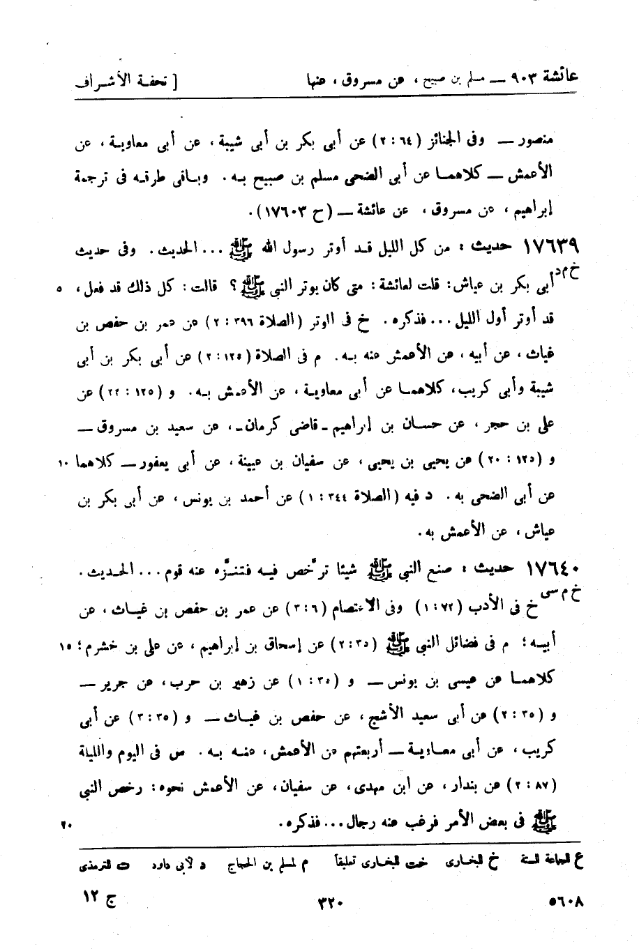 17639 -[خ م د] حديث: من كل الليل قد أوتر رسول الله صَلَّى اللَّهُ عَلَيْهِ وَسَلَّمَ ... الحديث. وفي حديث أبي بكر بن عياش: قلت لعائشة: متى كان يوتر النبي صَلَّى اللَّهُ عَلَيْهِ وَسَلَّمَ؟ قالت: كل ذلك قد فعل، قد أوتر أول الليل ... فذكره. خ في الوتر (الصلاة 396: 2) عن عمر بن حفص بن غياث، عن أبيه، عن الأعمش عنه به. م في الصلاة (125: 2) عن أبي بكر بن أبي شيبة، وأبي كريب، كلاهما عن أبي معاوية، عن الأعمش به. و (125: 22) عن علي بن حجر، عن حسان بن إبراهيم - قاضي كرمان -، عن سعيد بن مسروق - و (125: 20) عن يحيى بن يحيى، عن سفيان بن عيينة، عن أبي يعفور - كلاهما عن أبي الضحى به. د فيه (الصلاة 344: 1) عن أحمد بن يونس، عن أبي بكر بن عياش، عن الأعمش به.