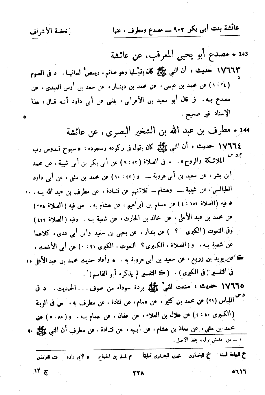 17664 -[م د س] حديث: أن النبي صَلَّى اللَّهُ عَلَيْهِ وَسَلَّمَ كان يقول في ركوعه وسجوده: سبوح قدوس رب الملائكة والروح. م في الصلاة (42: 9) عن أبي بكر بن أبي شيبة، عن محمد بن بشر، عن سعيد بن أبي عروبة - و (42: 10) عن محمد بن مثنى، عن أبي داود الطيالسي، عن شعبة - وهشام - ثلاثتهم عن قتادة، عن مطرف بن عبد الله به. د فيه (الصلاة 152: 4) عن مسلم بن إبراهيم، عن هشام به. س فيه (الصلاة 358) عن محمد بن عبد الأعلى، عن خالد بن الحارث، عن شعبة به. وفيه (الصلاة 422) وفي النعوت (الكبرى؟) عن بندار، عن يحيى بن سعيد وابن أبي عدي، كلاهما عن شعبة به. و (الصلاة، الكبرى؟ النعوت، الكبرى 21: 1) عن أبي الأشعث، عن يزيد بن زريع، عن سعيد بن أبي عروبة به. ك وأعاد حديث محمد بن عبد الأعلى في التفسير (في الكبرى) . (ك التفسير لم يذكره أبو القاسم) 1.
