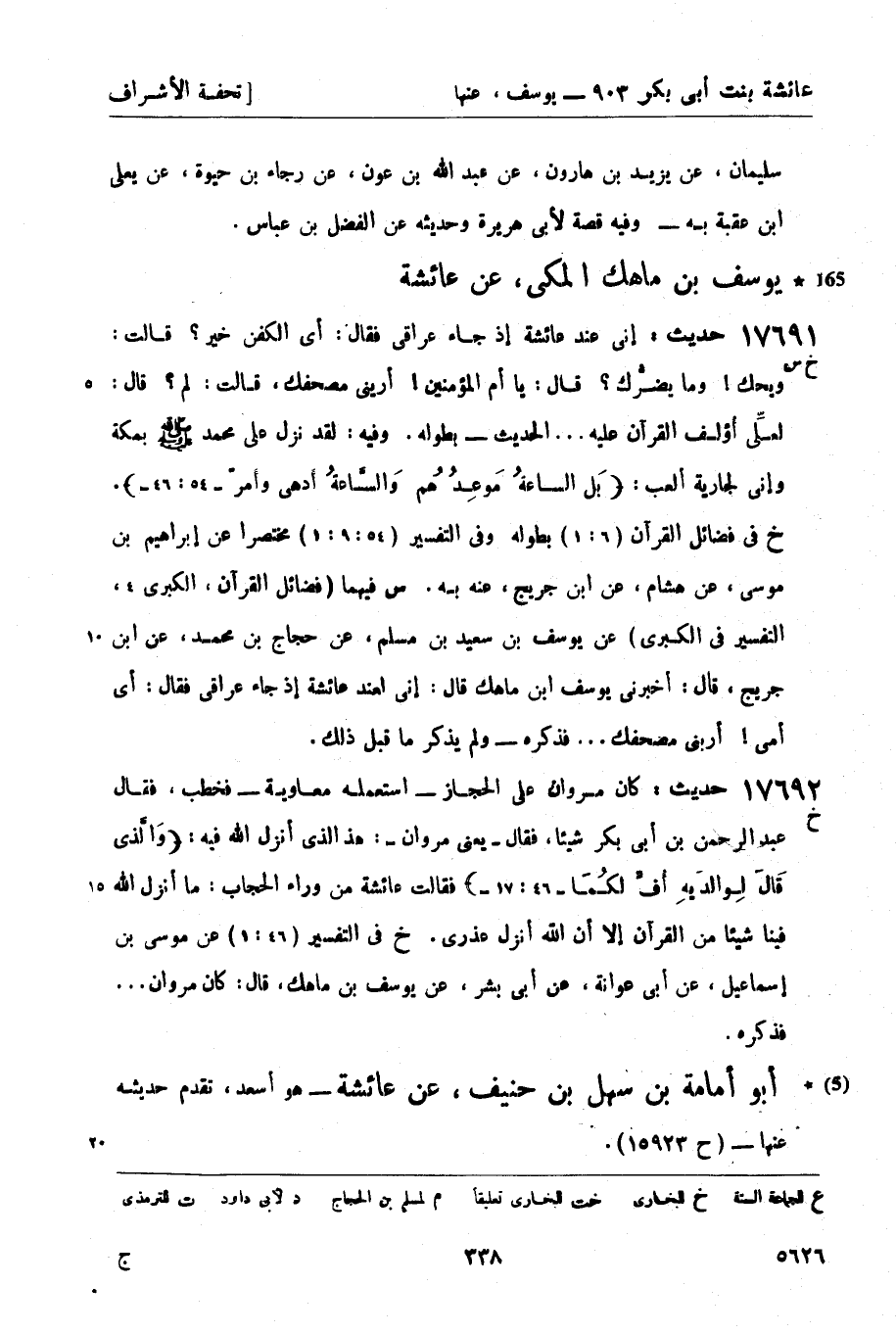 17691 -[خ س] حديث: إني عند عائشة إذ جاء عراقي فقال: أي الكفن خير؟ قالت: ويحك! وما يضرُّك؟ قال: يا أم المؤمنين! أريني مصحفك، قالت: لم؟ قال: لعلِّي أؤلف القرآن عليه ... الحديث - بطوله. وفيه: لقد نزل على محمد صَلَّى اللَّهُ عَلَيْهِ وَسَلَّمَ بمكة وإني لجارية ألعب: بَل الساعةُ مَوعِدُهُم وَالسَّاعَةُ أدهى وأمر (- 54: 46 -) . خ في فضائل القرآن (6: 1) بطوله وفي التفسير (54: 9: 1) مختصراً عن إبراهيم بن موسى، عن هشام، عن ابن جريج، عنه به. س فيهما (فضائل القرآن، الكبرى 4، التفسير في الكبرى) عن يوسف بن سعيد بن مسلم، عن حجاج بن محمد، عن ابن جريج، قال: أخبرني يوسف بن ماهك قال: إني لعند عائشة إذ جاء عراقي فقال: أي أمى! أربني مصحفك ... فذكره - ولم يذكر ما قبل ذلك.
