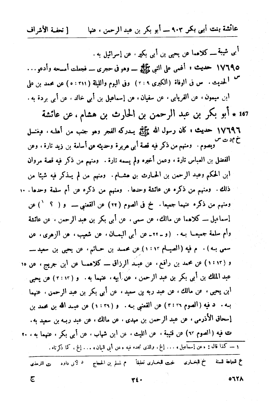 17696 -[خ م د ت س] حديث: كان رسول الله صَلَّى اللَّهُ عَلَيْهِ وَسَلَّمَ يدركه الفجر وهو جنب من أهله، فيغتسل ويصوم. ومنهم من ذكر فيه قصة أبي هريرة وحديثه عن أسامة بن زيد تارة، وعن الفضل بن العباس تارة، وعمن أخبره ولم يسمه تارة. ومنهم من ذكر فيه قصة مروان بن الحكم وعبد الرحمن بن الحارث بن هشام. ومنهم من لم يذكر فيه شيئاً من ذلك. ومنهم من ذكره عن عائشة وحدها. ومنهم من ذكره عن أم سلمة وحدها. ومنهم من ذكره عنهما جميعاً. خ في الصوم (22) عن القعنبي - و (؟ 1) عن إسماعيل - كلاهما عن مالك، عن سمي، عن أبي بكر بن عبد الرحمن، عن عائشة وأم سلمة جميعاً به. (و- 22 - عن أبي اليمان، عن شعيب، عن الزهري، عن سمي به) . م فيه (الصيام 13: 1) عن محمد بن حاتم، عن يحيى بن سعيد - و (13: 1) عن محمد بن رافع، عن عبد الرزاق - كلاهما عن ابن جريج، عن عبد الملك بن أبي بكر بن عبد الرحمن، عن أبيه، عنهما به. و (13: 3) عن يحيى بن يحيى، عن مالك، عن عبد ربه بن سعيد، عن أبي بكر بن عبد الرحمن، عنهما به. د فيه (الصوم 36: 3) عن القعنبي به. و (36: 1) عن عبد الله بن محمد بن إسحاق الأذرمي، عن عبد الرحمن بن مهدي، عن مالك، عن عبد ربه بن سعيد به. ت فيه (الصوم 63) عن قتيبة، عن الليث، عن ابن شهاب، عن أبي بكر، عنهما به، -[341]- وقال: حسن صحيح. س فيه (الصيام، الكبرى 8 - ألف: 3) عن قتيبة به. و (80: 10) عن يعقوب بن إبراهيم، عن يحيى بن سعيد به. و (80: 9) عن عمرو بن علي، عن فضيل بن سليمان، عن أبي حازم، عن عبد الملك بن أبي بكر به. و (80: 11) عن محمد بن سلمة، عن ابن القاسم، عن مالك، عن سمي به. و (80 - د: 1) عن محمد سلمة والحارث بن مسكين، كلاهما عن ابن القاسم، عن مالك، عن عبد ربه بن سعيد به. و (80 - ألف: 4) عن نصر بن علي، عن عبد الأعلى، عن معمر، عن الزهري - و (80 - ب: 1) عن الربيع بن سليمان - وهو ابن داود الجيزي، عن إسحاق بن بكر بن مضر، عن أبيه، عن جعفر بن ربيعة، عن عراك بن مالك - كلاهما عن أبي بكر به - عنهما. و (80: 7) عن أحمد بن منيع، عن إسماعيل ابن علية، عن أيوب، عن عكرمة بن خالد - و (80 - د: 3) عن محمد بن عبد الأعلى، عن معتمر بن سليمان، عن أبي عبد الرحمن خالد بن زيد1 الشأمي - و (80 - هـ: 1) عن عبد الله بن محمد بن إسحاق الأذرمي، عن عبدة بن حميد، عن منصور، عن مجاهد - و (80 - ط: 1) عن أحمد بن سليمان، عن يحيى بن آدم، عن مالك بن مغول، عن الحكم - أربعتهم عن أبي بكر بن عبد الرحمن، عن عائشة وحدها به. و (80 - و: 1) عن عمرو بن علي، عن يحيى بن سعيد، عن إسماعيل بن أبي خالد - و (80 - و: 3) عن عثمان بن عبد الله، عن عبيد الله بن محمد، عن عبد الواحد بن زياد، عن سليمان الشيباني - كلاهما عن الشعبي، عن أبي بكر به. و (80 - و: 2) عن زكريا بن يحيى، عن أبي حفص - وهو عمرو بن علي -، عن معتمر بن سليمان، عن إسماعيل، عن مجالد، عن الشعبي به. قال أبو حفص: فذكرته ليحيى فقال: [حدث] نا إسماعيل، عن الشعبي به. و (80 - ح: 1) عن -[342]- إسحاق بن إبراهيم، عن أبي معاوية، عن الأعمش، عن عمارة بن عمير - و (80 - ح: 2) عن زكريا بن يحيى، عن إسحاق بن إبراهيم، عن جرير، عن الأعمش، عن جامع بن شداد - قال (80 - ح: 3) : وحدثنا زكريا بن يحيى مرة أخرى عن إسحاق بن إبراهيم، عن جرير، عن الأعمش، عن عمارة بن عمير - وجامع بن شداد - كلاهما عن أبي بكر بن عبد الرحمن به. ز حديث الربيع بن سليمان الجيزي وجميع من ذكر قبله عن عائشة وأم سلمة جميعاً. وحديث أحمد بن منيع وجميع من ذكر بعده عن عائشة وحدها. وحديثه عن أم سلمة وحدها يأتي في مسندها - إن شاء الله تعالى. وحديث يونس [خ م س] ، عن الزهري في ترجمة عروة، عن عائشة - (ح 16701) . وحديث شعيب بن أبي حمزة [خ س] ، عن الزهري في ترجمة عبد الرحمن بن الحارث بن هشام، عن عائشة - (ح 16299) . فيه اختلاف كثير جداً على أبي بكر بن عبد الرحمن وغيره، قد ذكرنا بعضه في ترجمة الشعبي، عن عائشة - (ح 16171) ؛ وبعضه في ترجمة عبد الرحمن بن الحارث بن هشام، عن عائشة - (ح 16299) ؛ وبعضه في ترجمة أبي بكر بن عبد الرحمن، عن أم سلمة - (18228) . ذكر أبو القاسم في هذا الموضع حديث شعبة، عن الحكم، عن أبي بكر بن عبد الرحمن، عن عائشة - وهو وهم - والصواب عن أبيه، عن عائشة كما تقدم في موضعه - (ح 16299) - و