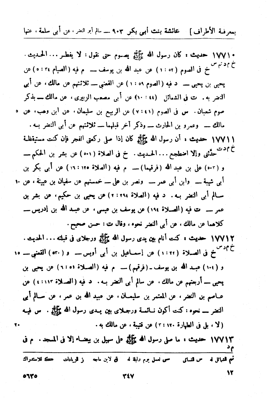 17712 -[خ م د س] حديث: كنت أنام بين يدي رسول الله صَلَّى اللَّهُ عَلَيْهِ وَسَلَّمَ ورجلاي في قبلته ... الحديث. خ في الصلاة (22: 1) عن إسماعيل بن أبي أويس - و (530) القعنبي - و (104) عبد الله بن يوسف - (فرقهم) - م فيه (الصلاة 51: 6) عن يحيى بن يحيى - أربعتهم عن مالك، عن سالم أبي النضر به. د فيه (الصلاة 113: 4) عن عاصم بن النضر، عن المعتمر بن سليمان، عن عبيد الله بن عمر، عن سالم أبي النضر - نحوه: كنت أكون نائمة ورجلاي بين يدي رسول الله صَلَّى اللَّهُ عَلَيْهِ وَسَلَّمَ. س فيه (لا، بل في الطهارة 120: 3) عن قتيبة، عن مالك به.