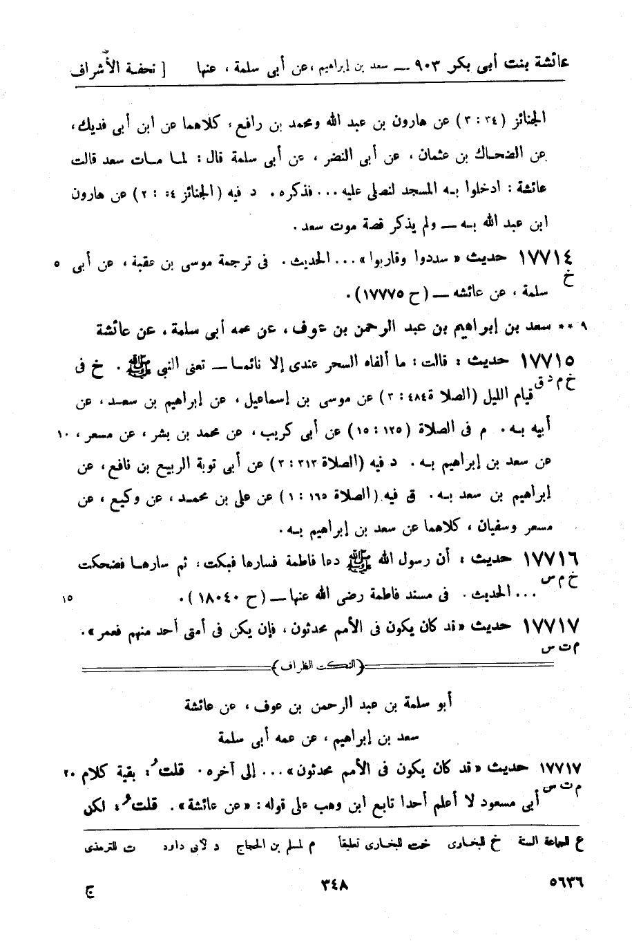 17715 -[خ م د ق] حديث: قالت: ما ألفاه السحر عندي إلا نائماً - تعني النبيّ صَلَّى اللَّهُ عَلَيْهِ وَسَلَّمَ. خ في قيام الليل (الصلاة 484: 3) عن موسى بن إسماعيل، عن إبراهيم بن سعد، عن أبيه به. م في الصلاة (125: 15) عن أبي كريب، عن محمد بن بشر، عن مسعر، عن سعد بن إبراهيم به. د فيه (الصلاة 313: 3) عن أبي توبة الربيع بن نافع، عن إبراهيم بن سعد به. ق فيه (الصلاة 165: 1) عن علي بن محمد، عن وكيع، عن مسعر وسفيان، كلاهما عن سعد بن إبراهيم به.