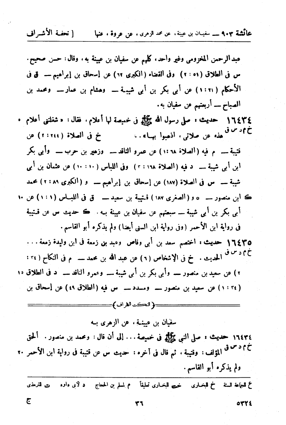 16434 -[خ م د س ق] حديث: صلى رسول الله صَلَّى اللَّهُ عَلَيْهِ وَسَلَّمَ في خميصة لها أعلام، فقال: شغلتني أعلام هذه عن صلاتي، اذهبوا بها ... الحديث. خ في الصلاة (244: 2) عن قتيبة - م فيه (الصلاة 68: 1) عن عمرو الناقد - وزهير بن حرب - وأبي بكر بن أبي شيبة - د فيه (الصلاة 168: 3) وفي اللباس (10: 10) عن عثمان بن أبي شيبة - س في الصلاة (187) عن إسحاق بن إبراهيم - و (الكبرى 89: 2) محمد بن منصور - ك و (الصغرى 187) قتيبة بن سعيد - ق في اللباس (1: 1) عن أبي بكر بن أبي شيبة - سبعتهم عن سفيان بن عيينة به. ك حديث س عن قتيبة في رواية ابن الأحمر (وفي رواية ابن السني أيضاً) ولم يذكره أبو القاسم.