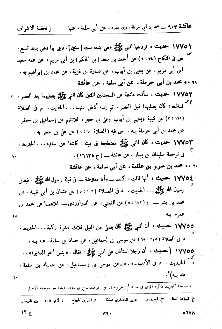 17751 -[س] حديث: تزوجها النبي صَلَّى اللَّهُ عَلَيْهِ وَسَلَّمَ وهي بنت ست [سنين] ، وبنى بها وهي بنت تسع. س في النكاح (78: 2) عن أحمد بن سعد (بن الحكم) بن أبي مريم، عن عمه سعيد بن أبي مريم، عن يحيى بن أيوب، عن عمارة بن غزية، عن محمد بن إبراهيم به.