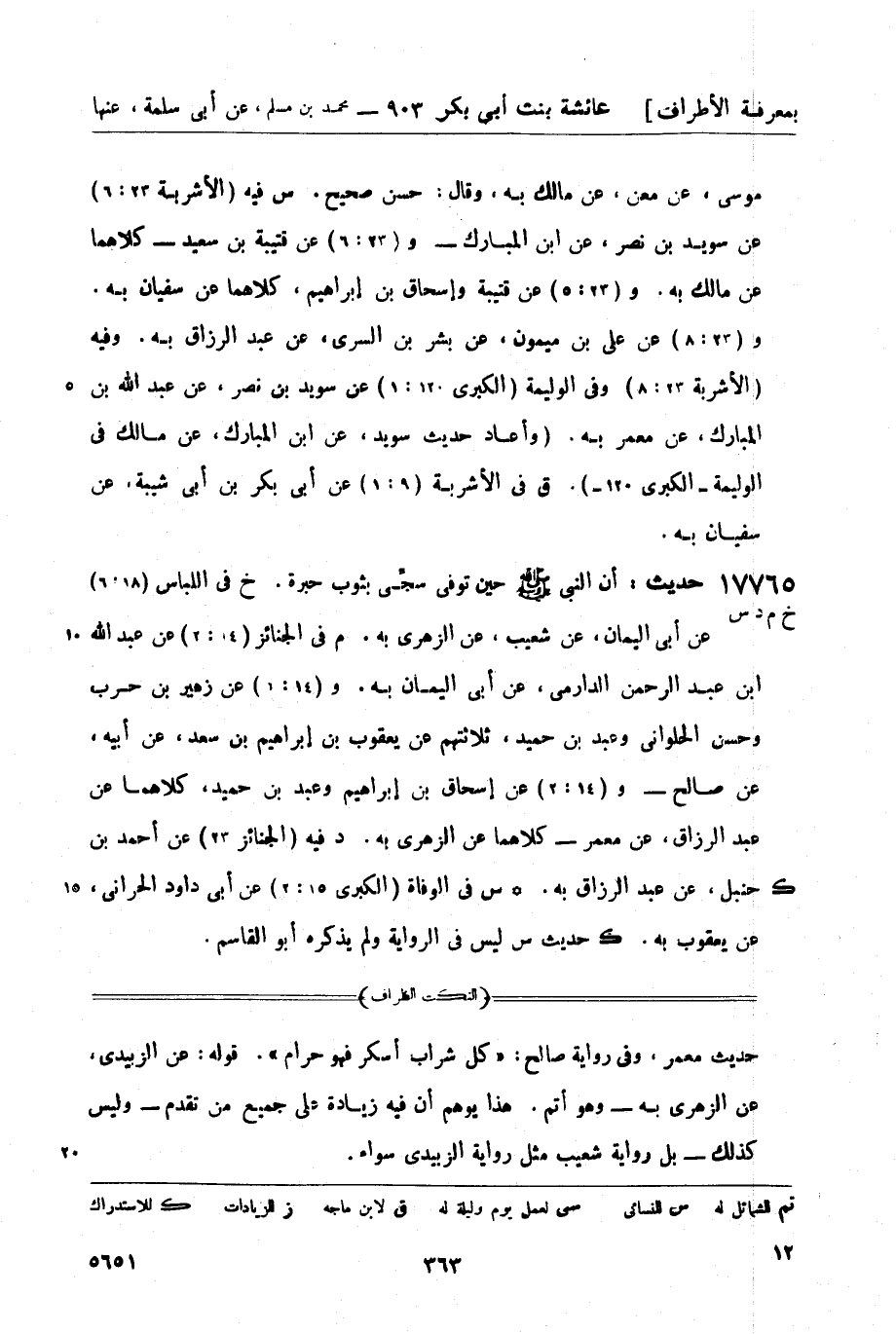 17765 -[خ م د س] حديث: أن النبي صَلَّى اللَّهُ عَلَيْهِ وَسَلَّمَ حين توفى سجى بثوب حبرة. خ في اللباس (18: 6) عن أبي اليمان، عن شعيب، عن الزهري به. م في الجنائز (14: 2) عن عبد الله بن عبد الرحمن الدارمي، عن أبي اليمان به. و (14: 1) عن زهير بن حرب وحسن الحلواني وعبد بن حميد، ثلاثتهم عن يعقوب بن إبراهيم بن سعد، عن أبيه، عن صالح - و (14: 2) عن إسحاق بن إبراهيم وعبد بن حميد، كلاهما عن عبد الرزاق، عن معمر - كلاهما عن الزهري به. د فيه (الجنائز 23) عن أحمد بن حنبل، عن عبد الرزاق به. ك س في الوفاة (الكبرى 15: 2) عن أبي داود الحراني، عن يعقوب به. ك حديث س ليس في الرواية ولم يذكره أبو القاسم.