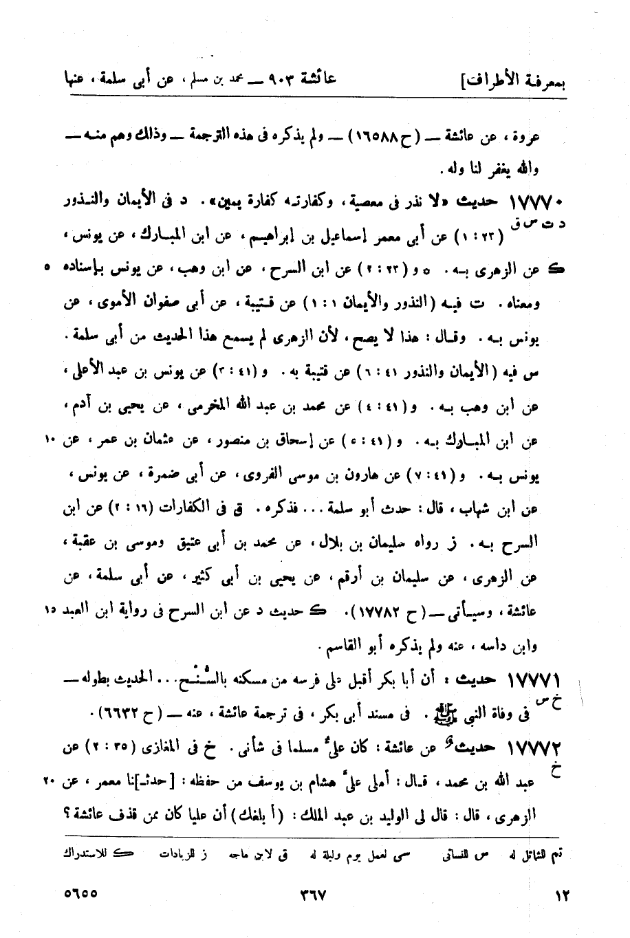 17770 -[د ت س ق] حديث لا نذر في معصية، وكفارته كفارة يمين. د في الأيمان والنذور (23: 1) عن أبي معمر إسماعيل بن إبراهيم، عن ابن المبارك، عن يونس، عن الزهري به. ك و (23: 2) عن ابن السرح، عن ابن وهب، عن يونس بإسناده ومعناه. ت فيه (النذور والأيمان 1: 1) عن قتيبة، عن أبي صفوان الأموي، عن يونس به. وقال: هذا لا يصح، لأن الزهري لم يسمع هذا الحديث من أبي سلمة. س فيه (الأيمان والنذور 41: 6) عن قتيبة به. و (41: 3) عن يونس بن عبد الأعلى، عن ابن وهب به. و (41: 4) عن محمد بن عبد الله المخرمي، عن يحيى بن آدم، عن ابن المبارك به. و (41: 5) عن إسحاق بن منصور، عن عثمان بن عمر، عن يونس به. و (41: 7) عن هارون بن موسى الفروي، عن أبي ضمرة، عن يونس، عن ابن شهاب، قال: حديث أبو سلمة ... فذكره. ق في الكفارات (16: 2) عن ابن السرح به. ز رواه سليمان بن بلال، عن محمد بن أبي عتيق، وموسى بن عقبة، عن الزهري، عن سليمان بن أرقم، عن يحيى بن أبي كثير، عن أبي سلمة، عن عائشة، وسيأتي - (ح 17782) . ك حديث د عن ابن السرح في رواية ابن العبد وابن داسه، عنه ولم يذكره أبو القاسم.