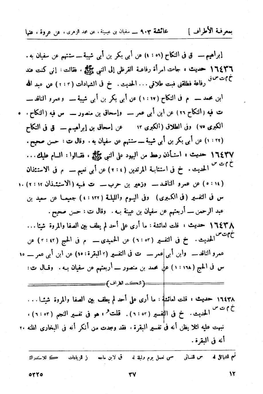16438 -[خ م ت س] حديث: قلت لعائشة: ما أرى على أحد لم يطف بين الصفا والمروة شيئاً ... الحديث. خ في التفسير (53: 6) عن الحميدي - م في الحج (43: 3) عن عمرو الناقد - وابن أبي عمر - ت في التفسير (3 البقرة: 15) عن ابن أبي عمر - س في الحج (168: 1) عن محمد بن منصور - أربعتهم عن سفيان به. وقال ت: -[38]- حسن صحيح.