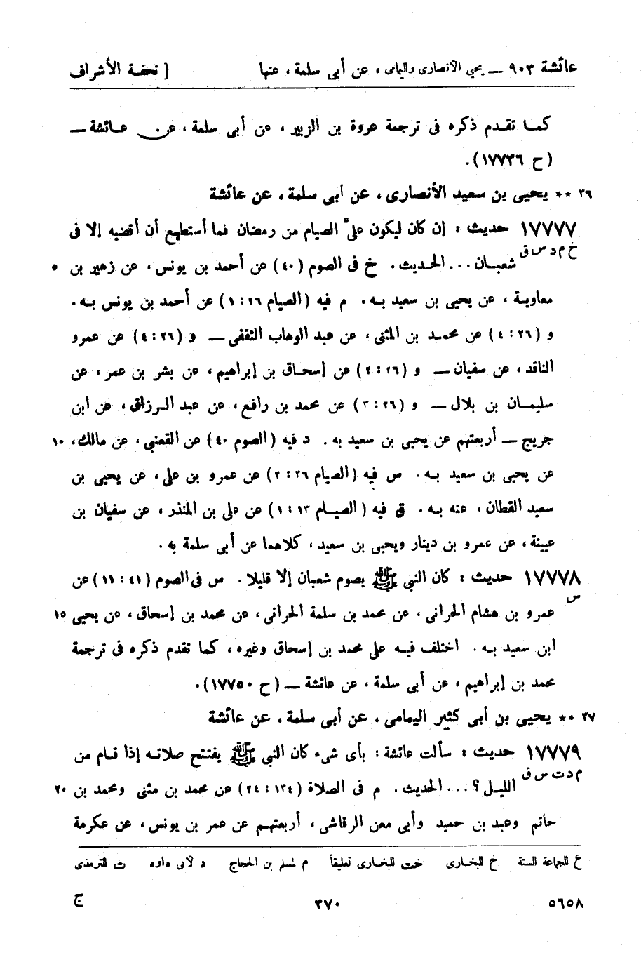 17777 -[خ م د س ق] حديث: إن كان ليكون عليَّ الصيام من رمضان فما أستطيع أن أقضيه إلا في شعبان ... الحديث. خ في الصوم (40) عن أحمد بن يونس، عن زهير بن معاوية، عن يحيى بن سعيد به. م فيه (الصيام 26: 1) عن أحمد بن يونس به. و (26: 4) عن محمد بن المثنى، عن عبد الوهاب الثقفي - و (26: 4) عن عمرو الناقد، عن سفيان - و (26: 2) عن إسحاق بن إبراهيم، عن بشر بن عمر، عن سليمان بن بلال - و (26: 3) عن محمد بن رافع، عن عبد الرزاق، عن ابن جريج - أربعتهم عن يحيى بن سعيد به. د فيه (الصوم 40) عن القعنبي، عن مالك، عن يحيى بن سعيد به. س فيه (الصيام 36: 2) عن عمرو بن علي، عن يحيى بن سعيد القطان، عنه به. ق فيه (الصيام 13: 1) عن علي بن المنذر، عن سفيان بن عيينة، عن عمرو بن دينار ويحيى بن سعيد، كلاهما عن أبي سلمة به.