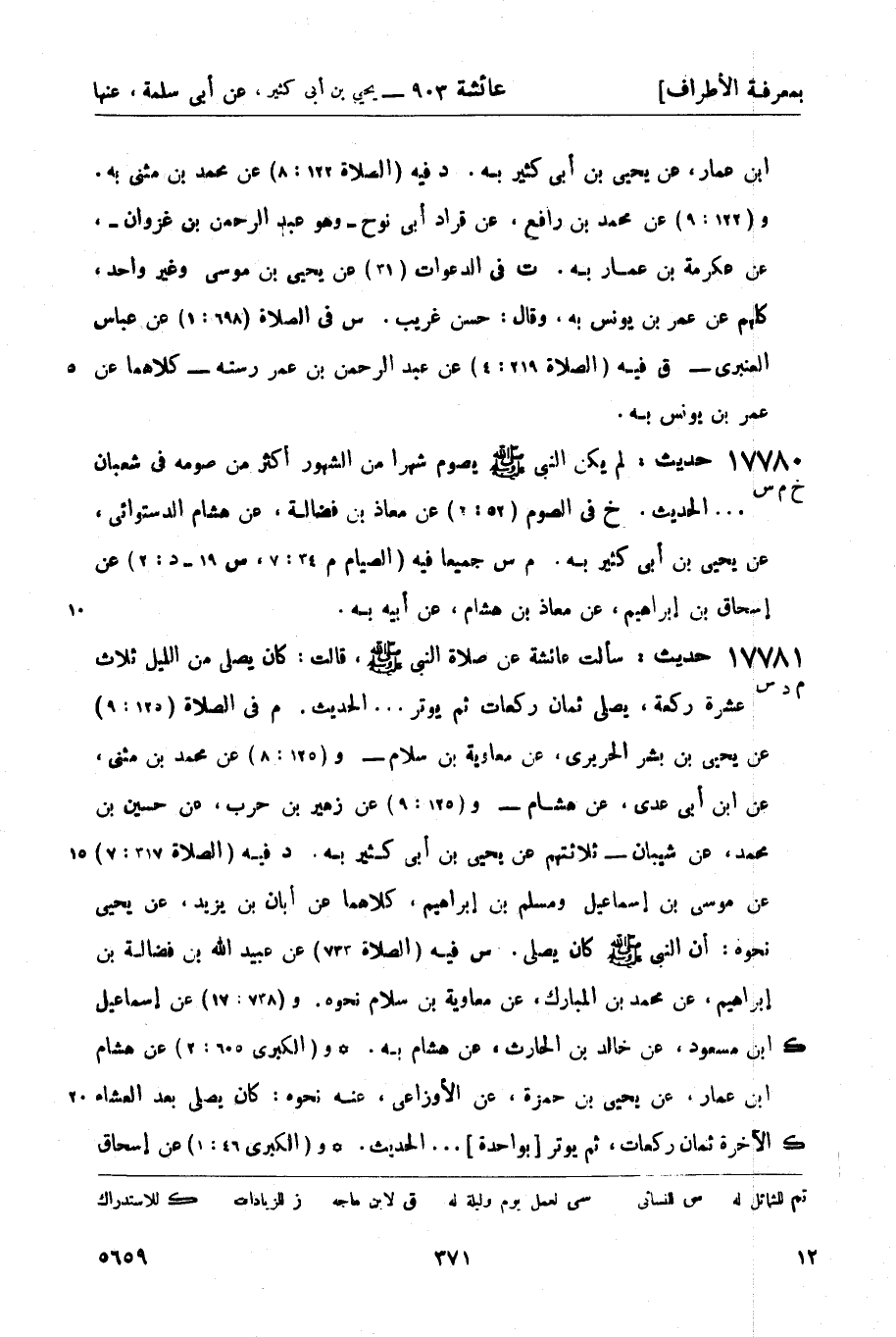 17781 - (د م س) حديث: سألت عائشة عن صلاة النبيّ صَلَّى اللَّهُ عَلَيْهِ وَسَلَّمَ، قالت: كان يصلي من الليل ثلاث عشرة ركعة، يصلي ثمان ركعات ثم يوتر ... الحديث. م في الصلاة (125: 9) عن يحيى بن بشر الحريري، عن معاوية بن سلام - و (125: 8) عن محمد بن مثنى، عن ابن أبي عدي، عن هشام - و (125: 9) عن زهير بن حرب، عن حسين بن محمد، عن شيبان - ثلاثتهم عن يحيى بن أبي كثير به. د فيه (الصلاة 317: 7) عن موسى بن إسماعيل ومسلم بن إبراهيم، كلاهما عن أبان بن يزيد، عن يحيى نحوه: أن النبي صَلَّى اللَّهُ عَلَيْهِ وَسَلَّمَ كان يصلي. س فيه (الصلاة 733) عن عبيد الله بن فضالة بن إبراهيم، عن محمد بن المبارك، عن معاوية بن سلام نحوه. و (738: 17) عن إسماعيل بن مسعود، عن خالد بن الحارث، عن هشام به. ك و (الكبرى 605: 2) عن هشام بن عمار، عن يحيى بن حمزة، عن الأوزاعي، عنه نحوه: كان يصلي بعد العشاء الآخرة ثمان ركعات، ثم يوتر [بواحدة] ... الحديث. ك و (الكبرى 46: 1) عن إسحاق -[372]- بن إبراهيم، عن معاذ بن هشام، عن أبيه نحوه. و (المجتبى 873: 16) عن محمود بن خالد، عن الوليد، عن الأوزاعي، عن يحيى به - مختصراً: كان يصلي ركعتين ... الحديث. ك حديث س عن هشام بن عمار وعن إسحاق بن إبراهيم ليس في الرواية ولم يذكره أبو القاسم.