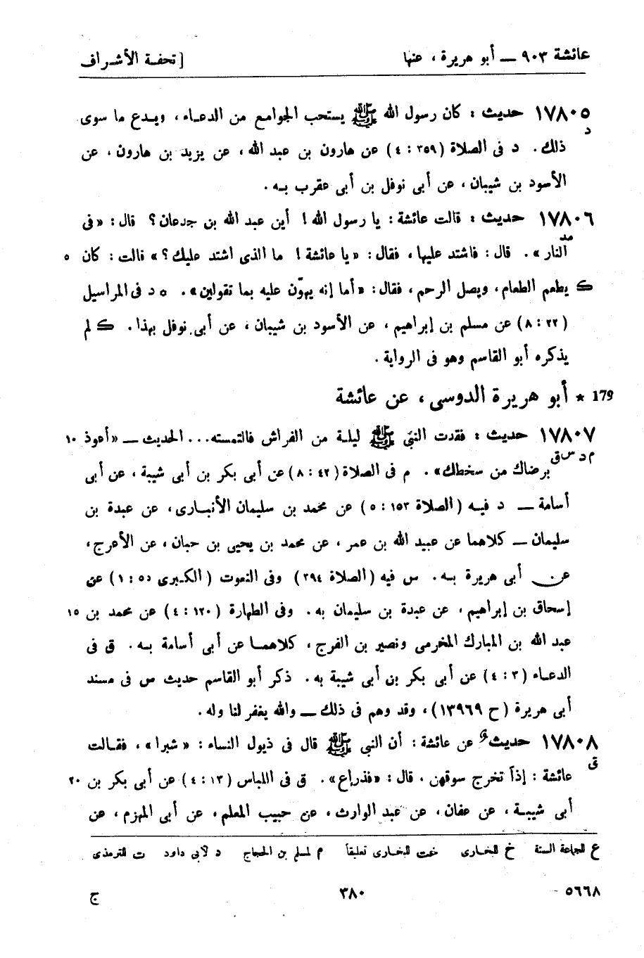 17807 -[م د س ق] حديث: فقدت النبي صَلَّى اللَّهُ عَلَيْهِ وَسَلَّمَ ليلة من الفراش فالتمسه ... الحديث - أعوذ برضاك من سخطك. م في الصلاة (42: 8) عن أبي بكر بن أبي شيبة، عن أبي أسامة - د فيه (الصلاة 153: 5) عن محمد بن سليمان الأنباري، عن عبدة بن سليمان - كلاهما عن عبيد الله بن عمر، عن محمد بن يحيى بن حبان، عن الأعرج، عن أبي هريرة به. س فيه (الصلاة 394) وفي النعوت (الكبرى 55: 1) عن إسحاق بن إبراهيم، عن عبدة بن سليمان به. وفي الطهارة (120: 4) عن محمد بن عبد الله بن المبارك المخرمي ونصير بن الفرج، كلاهما عن أبي أسامة به. ق في الدعاء (3: 4) عن أبي بكر بن أبي شيبة به. ذكر أبو القاسم حديث س في مسند أبي هريرة (ح 13969) ، وقد وهم في ذلك - والله يغفر لنا وله.