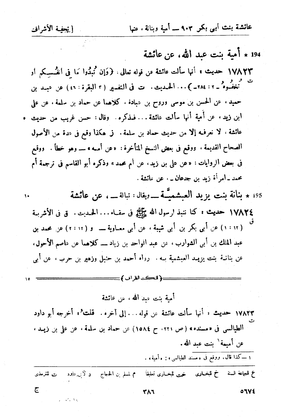 17823 -[ت] حديث: أنها سألت عائشة عن قوله تعالى: وَإن تُبدُوا مَا فِي أنفُسِكم أو تُخفُوهُ ... (- 2: 284 -) ... الحديث. ت في التفسير (3 البقرة: 46) عن عبد بن حميد، عن الحسن بن موسى وروح بن عبادة، كلاهما عن حماد بن سلمة، عن علي بن زيد، عن أمية أنها سألت عائشة ... فذكره. وقال: حسن غريب من حديث عائشة، لا نعرفه إلا من حديث حماد بن سلمة. ز هكذا وقع في عدة من الأصول الصحاح القديمة، ووقع في بعض النسخ المتأخرة: عن أمه - وهو خطأ. ووقع في بعض الروايات: عن علي بن زيد، عن أم محمد وذكره أبو القاسم في ترجمة أم محمد - امرأة زيد بن جدعان -، عن عائشة.