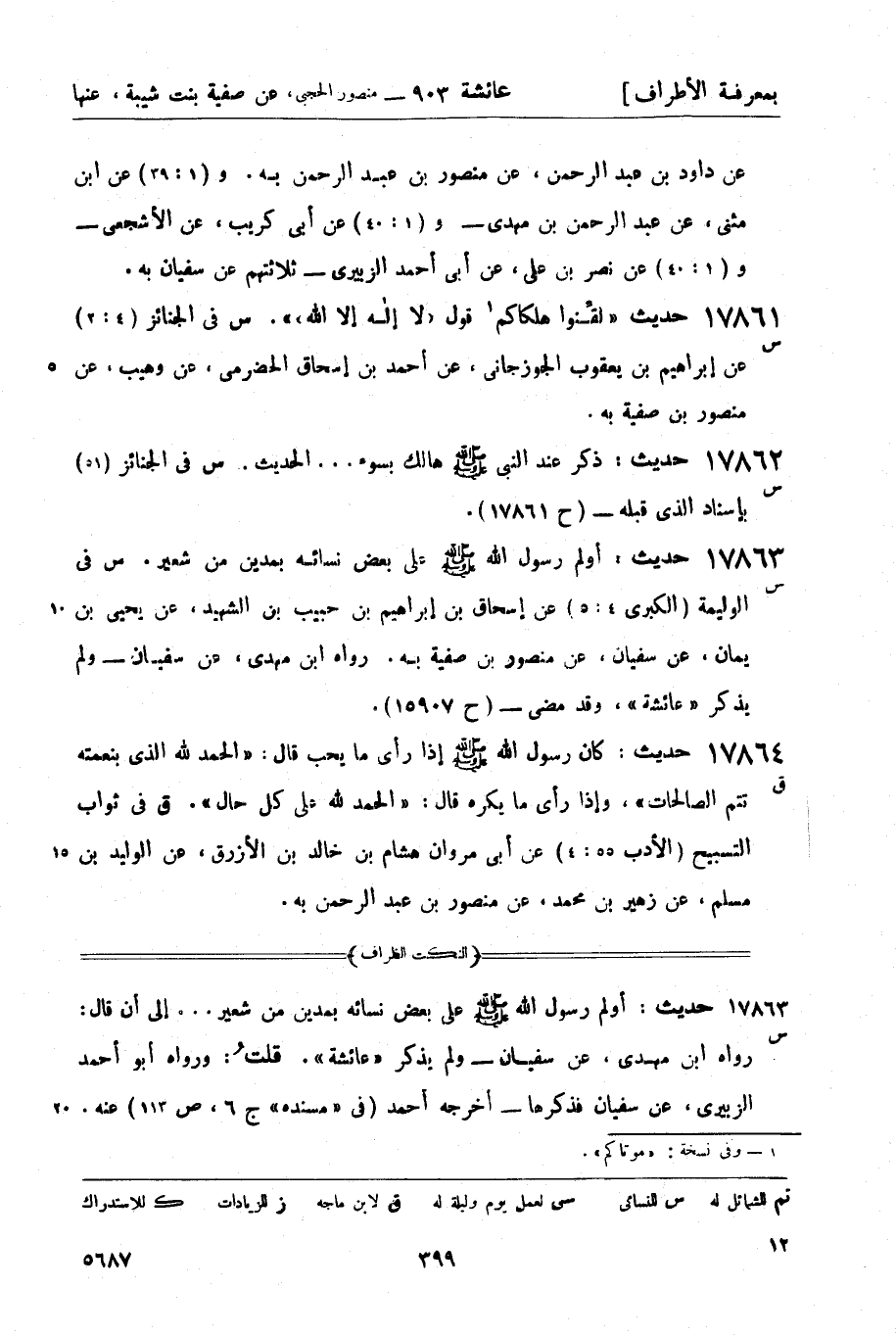 17864 -[ق] حديث: كان رسول الله صَلَّى اللَّهُ عَلَيْهِ وَسَلَّمَ إذا رأى ما يحب قال: الحمد لله الذي بنعمته تتم الصالحات، وإذا رأى ما يكره قال: الحمد لله على كل حال. ق في ثواب التسبيح (الأدب 55: 4) عن أبي مروان هشام بن خالد بن الأزرق، عن الوليد بن مسلم، عن زهير بن محمد، عن منصور بن عبد الرحمن به.