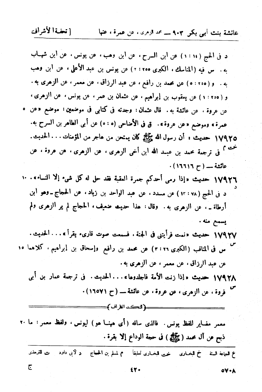 17926 -[د] حديث: إذا رمى أحدكم جمرة العقبة فقد حل له كل شيء إلا النساء. د في الحج (78: 13) عن مسدد، عن عبد الواحد بن زياد، عن الحجاج - وهو ابن أرطاة -، عن الزهري به. وقال: هذا حديث ضعيف، الحجاج لم ير الزهري ولم يسمع منه.