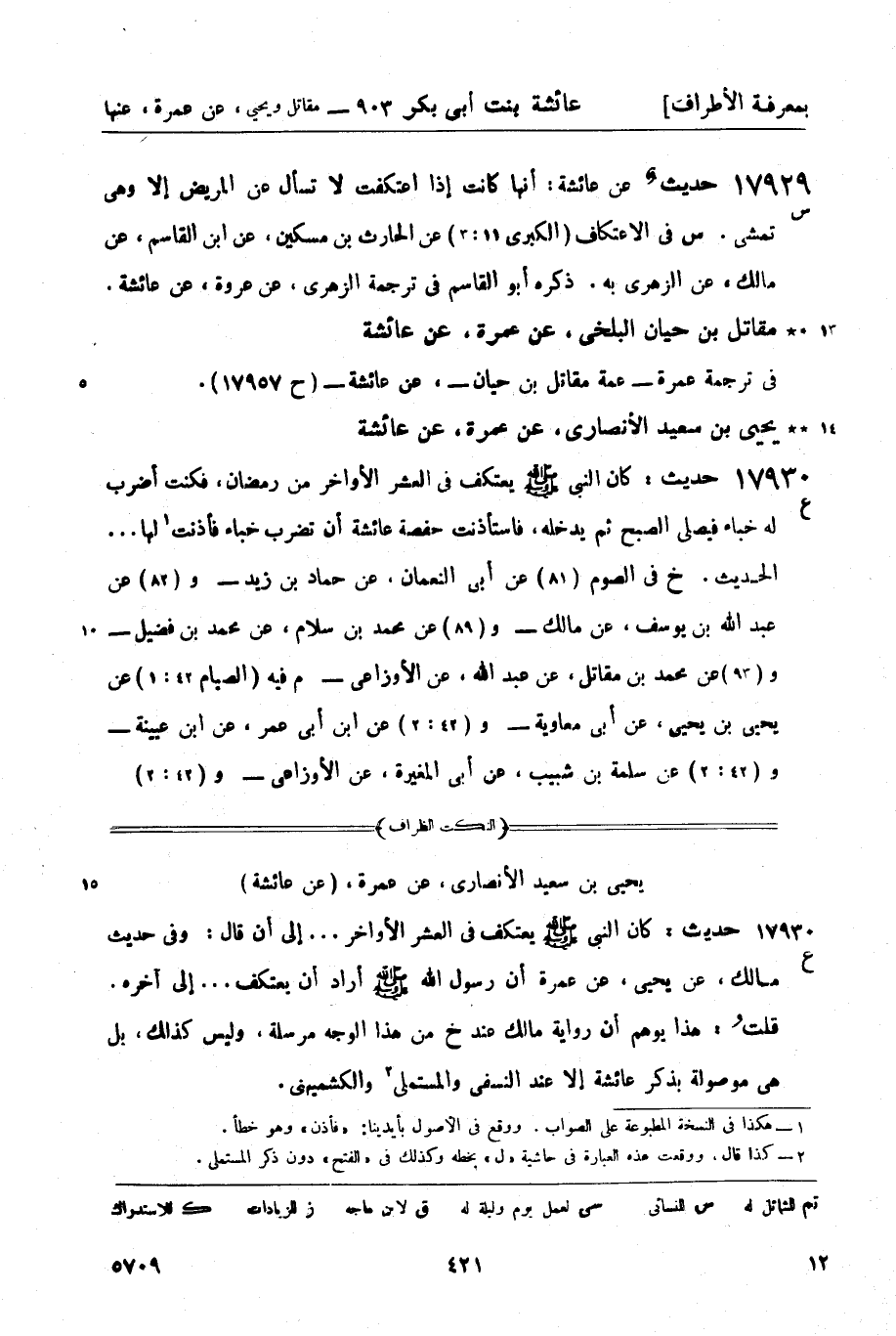 17930 -[ع] حديث: كان النبي صَلَّى اللَّهُ عَلَيْهِ وَسَلَّمَ يعتكف في العشر الأواخر من رمضان، فكنت أضرب له خباء فيصلي الصبح ثم يدخله، فاستأذنت حفصة عائشة أن تضرب خباء فأذنت1 لها ... الحديث. خ في الصوم (81) عن أبي النعمان، عن حماد بن زيد - و (82) عن عبد الله بن يوسف، عن مالك - و (89) عن محمد بن سلام، عن محمد بن فضيل - و (93) عن محمد بن مقاتل، عن عبد الله، عن الأوزاعي - م فيه (الصيام 42: 1) عن يحيى بن يحيى، عن أبي معاوية - و (42: 2) عن ابن أبي عمر، عن ابن عيينة - و (42: 2) عن سلمة بن شبيب، عن أبي المغيرة، عن الأوزاعي - و [422]- (42: 2) عن عمرو بن سواد، عن ابن وهب، عن عمرو بن الحارث - و (42: 2) عن محمد بن رافع، عن أبي أحمد الزبيري، عن سفيان الثوري - و (42: 2) عن زهير بن حرب، عن يعقوب إبراهيم بن سعد، عن أبيه، عن محمد بن إسحاق - د فيه (الصوم 77: 3) عن عثمان بن أبي شيبة، عن أبي معاوية - ويعلى بن عبيد - عشرتهم عن يحيى بن سعيد به. وفي حديث مالك، عن يحيى، عن عمرة أن رسول الله صَلَّى اللَّهُ عَلَيْهِ وَسَلَّمَ أراد أن يعتكف، فلما انصرف إلى المكان الذي أراد أن يعتكف فيه إذا أخبية: خباء عائشة وخباء حفصة وخباء زينب. ت فيه (الصيام 71: 2) عن هناد، عن أبي معاوية به. وقال: رواه الأوزاعي وسفيان الثوري، عن يحيى هكذا. ورواه مالك وغير واحد، عن يحيى - مرسلاً، س في الصلاة (139: 1) عن أبي داود الحراني، عن يعلى بن عبيد به. وفي الاعتكاف (الكبرى 5) عن محمد بن منصور، عن سفيان بن عيينة به. و (3) عن أحمد بن سليمان، عن مسكين بن بكير، عن الأوزاعي به. ق في الصوم (59) عن أبي بكر بن شيبة، عن يعلى بن عبيد به - وفي ألفاظهم اختلاف، والمعنى متقارب.