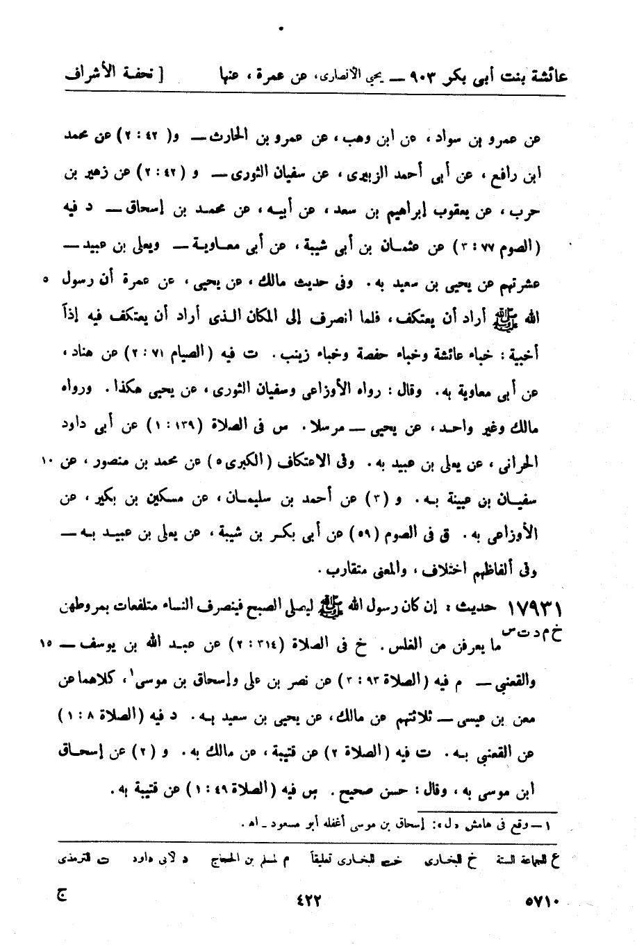 17931 -[خ م د ت س] حديث: إن كان رسول الله صَلَّى اللَّهُ عَلَيْهِ وَسَلَّمَ ليصلي الصبح فينصرف النساء متلفعات بمروطهن ما يعرفن من الغلس. خ في الصلاة (314: 2) عن عبد الله بن يوسف - والقعنبي - م فيه (الصلاة 93: 3) عن نصر بن علي وإسحاق بن موسى1، كلاهما عن معن بن عيسى - ثلاثتهم عن مالك، عن يحيى بن سعيد به. د فيه (الصلاة 8: 1) عن القعنبي به. ت فيه (الصلاة 2) عن قتيبة، عن مالك به. و (2) عن إسحاق بن موسى به، وقال: حسن صحيح. س فيه (الصلاة 49: 1) عن قتيبة به.