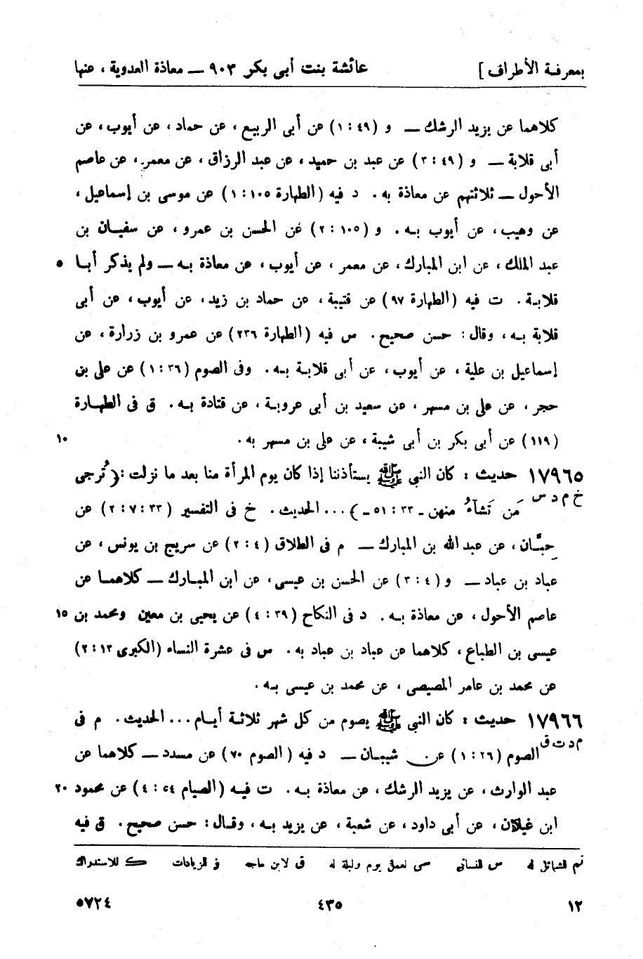 17965 -[خ م د س] حديث: كان النبي صَلَّى اللَّهُ عَلَيْهِ وَسَلَّمَ يستأذننا إذا كان يوم المرأة منا بعد ما نزلت: ترجي من تَشاءُ (- 33: 51 -) ... الحديث. خ في التفسير (33: 7: 2) عن حِبَّان، عن عبد الله بن المبارك - م في الطلاق (4: 2) عن سريج بن يونس، عن عباد بن عباد - و (4: 3) عن الحسن بن عيسى، عن ابن المبارك - كلاهما عن عاصم الأحول، عن معاذ به. د في النكاح (39: 4) عن يحيى بن معين ومحمد بن عيسى بن الطباع، كلاهما عن عباد بن عباد به. س في عشرة النساء (الكبرى 13: 2) عن محمد بن عامر المصيصي، عن محمد بن عيسى به.