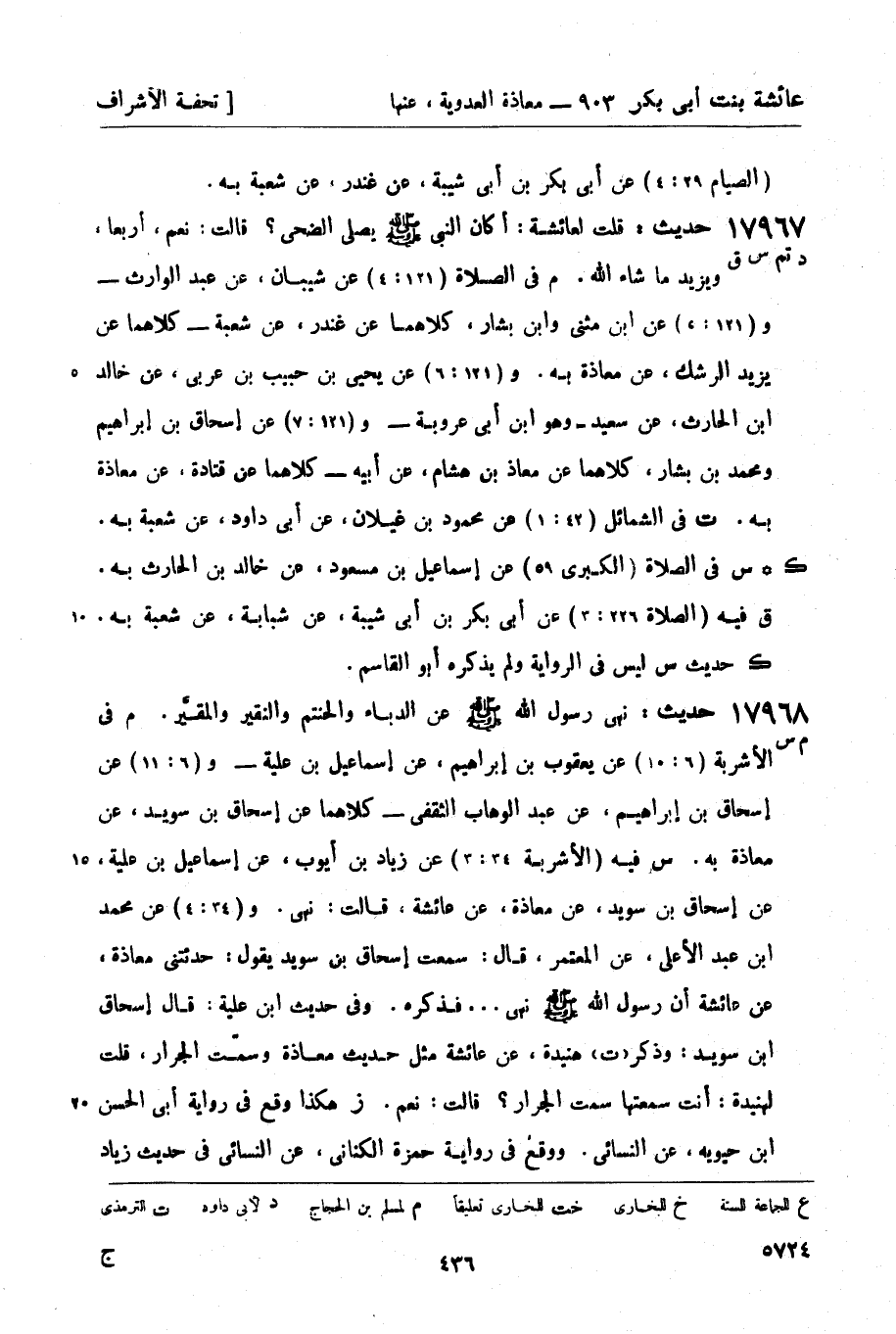 17967 - (د تم س ق) حديث: قلت لعائشة: أكان النبي صَلَّى اللَّهُ عَلَيْهِ وَسَلَّمَ يصلي الضحى؟ قالت: نعم، أربعاً، ويزيد ما شاء الله. م في الصلاة (121: 4) عن شيبان، عن عبد الوارث - و (121: 5) عن ابن مثنى وابن بشار، كلاهما عن غندر، عن شعبة - كلاهما عن يزيد الرشك، عن معاذة به. و (121: 6) عن يحيى بن حبيب بن عربي، عن خالد بن الحارث، عن سعيد - وهو ابن أبي عروبة - و (121: 7) عن إسحاق بن إبراهيم ومحمد بن بشار، كلاهما عن معاذ بن هشام، عن أبيه - كلاهما عن قتادة، عن معاذة به. ت في الشمائل (42: 1) عن محمود بن غيلان، عن أبي داود، عن شعبة به. ك س في الصلاة (الكبرى 59) عن إسماعيل بن مسعود، عن خالد بن الحارث به. ق فيه (الصلاة 226: 3) عن أبي بكر بن أبي شيبة، عن شبابة، عن شعبة به. ك حديث س ليس في الرواية ولم يذكره أبو القاسم.