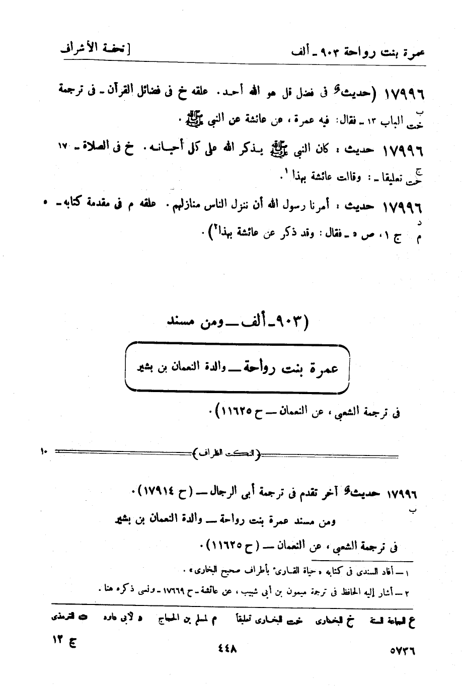 ألف - ومن مسند عمرة بنت رواحة - والدة النعمان بن بشير في ترجمة الشعبي، عن النعمان - ح 11625) .