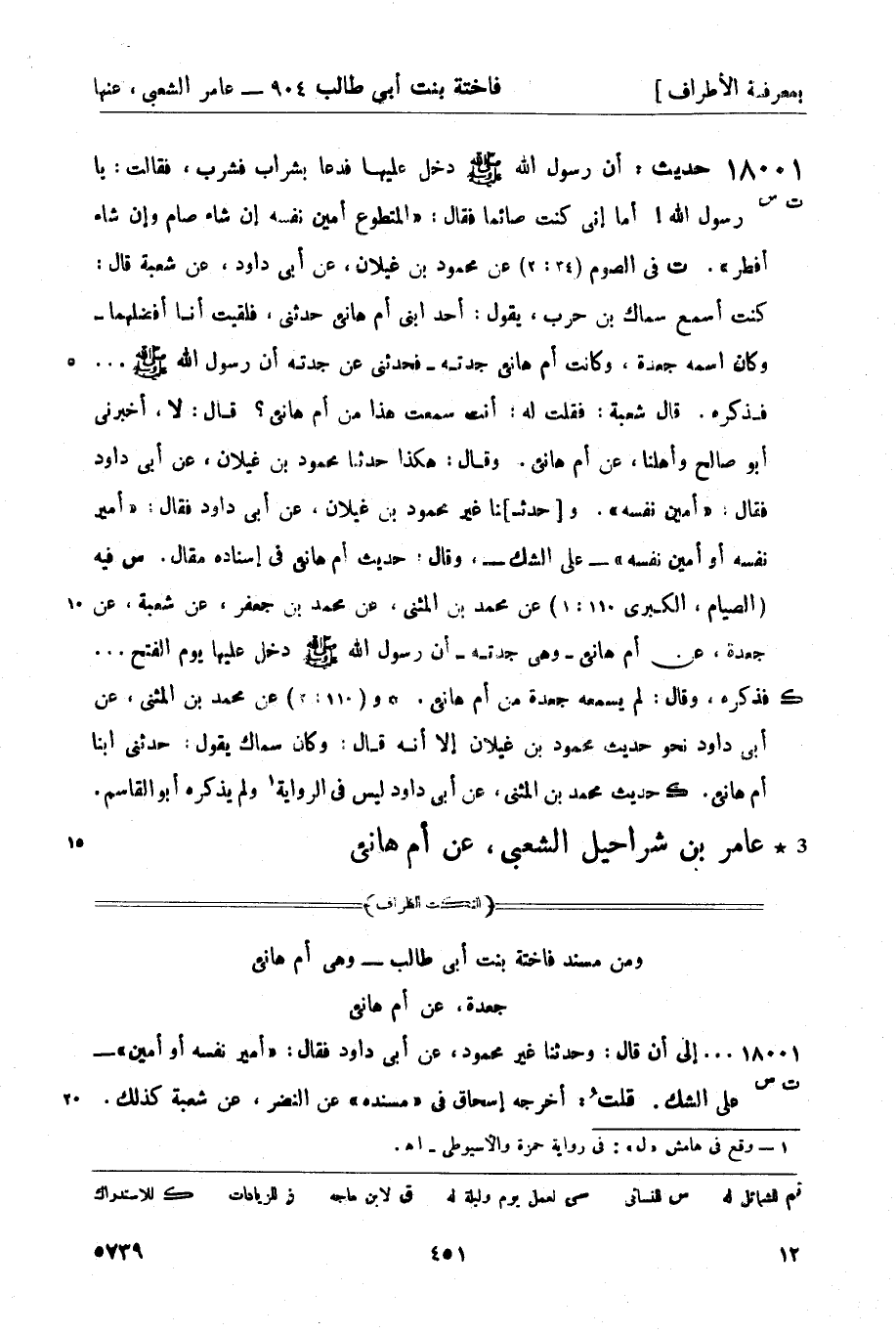 18001 -[ت س] حديث: أن رسول الله صَلَّى اللَّهُ عَلَيْهِ وَسَلَّمَ دخل عليها فدعا بشراب فشرب، فقالت: يا رسول الله! أما إني كنت صائماً فقال: المتطوع آمين نفسه إن شاء صام وإن شاء أفطر. ت في الصوم (34: 2) عن محمود بن غيلان، عن أبي داود، عن شعبة قال: كنت أسمع سماك بن حرب يقول: أحد ابنى أم هانئ حدثني، فلقيت أنا أفضلهما - وكان اسمه جعدة، وكانت أم هانئ جدته - فحدثني عن جدته أن رسول الله صَلَّى اللَّهُ عَلَيْهِ وَسَلَّمَ ... فذكره. قال شعبة: فقلت له: أنت سمعت هذا من أم هانئ؟ قال: لا، أخبرني أبو صالح وأهلنا، عن أم هانئ. وقال: هكذا حدثنا محمود بن غيلان، عن أبي داود فقال: آمين نفسه. و [حدث] نا غير محمود بن غيلان، عن أبي داود فقال: أمير نفسه أو أمين نفسه - على الشك -، وقال: حديث أم هانئ في إسناده مقال. س فيه (الصيام، الكبرى 110: 1) عن محمد بن المثنى، عن محمد بن جعفر، عن شعبة، عن جعدة، عن أم هانئ - وهي جدته - أن رسول الله صَلَّى اللَّهُ عَلَيْهِ وَسَلَّمَ دخل عليها يوم الفتح ... فذكره، وقال: لم يسمعه جعدة من أم هانئ. ك و (110: 2) عن محمد بن المثنى، عن أبي داود نحو حديث محمود بن غيلان إلا أنه قال: وكان سماك يقول: حدثني ابنا أم هانئ. ك حديث محمد بن المثنى، عن أبي داود ليس في الرواية1 ولم يذكره أبو القاسم.