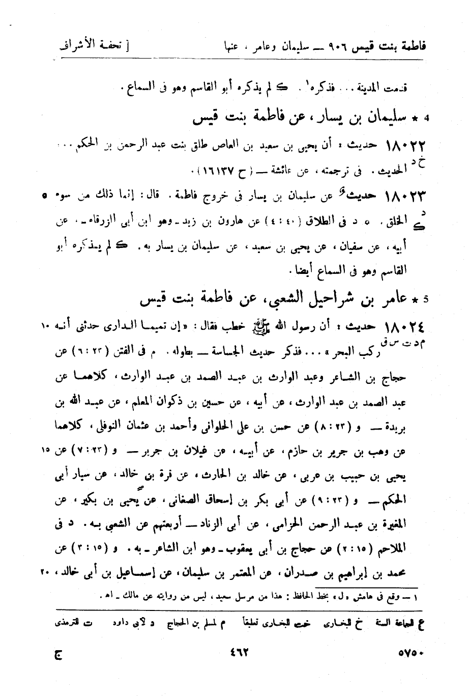 18024 -[م د ت س ق] حديث: أن رسول الله صَلَّى اللَّهُ عَلَيْهِ وَسَلَّمَ خطب فقال: إن تميماً الداري حدثني أنه ركب البحر ... فذكر حديث الجساسة - بطوله. م في الفتن (23: 6) عن حجاج بن الشاعر وعبد الوارث بن عبد الصمد بن عبد الوارث، كلاهما عن عبد الصمد بن عبد الوارث، عن أبيه، عن حسين بن ذكوان المعلم، عن عبد الله بن بريدة - و (23: 8) عن حسن بن علي الحلواني وأحمد بن عثمان النوفلي، كلاهما عن وهب بن جرير بن حازم، عن أبيه، عن غيلان بن جرير - و (23: 7) عن يحيى بن حبيب بن عربي، عن خالد بن الحارث، عن قرة بن خالد، عن سيار أبي الحكم - و (23: 9) عن أبي بكر بن إسحاق الصغاني، عن يحيى بن بكير، عن المغيرة بن عبد الرحمن الحزامي، عن أبي الزناد - أربعتهم عن الشعبي به. د في الملاحم (15: 2) عن حجاج بن أبي يعقوب - وهو ابن الشاعر - به. و (15: 3) عن محمد بن إبراهيم بن صدران، عن المعتمر بن سليمان، عن إسماعيل بن أبي خالد، -[463]- عن مجالد بن سعيد، عن الشعبي بمعناه. ت في الفتن (66) عن محمد بن بشار، عن معاذ بن هشام، عن أبيه، عن قتادة، عن الشعبي نحوه، وقال: حسن صحيح، غريب من حديث قتادة، عن الشعبي. س في الحج (الكبرى 306: 5) عن ابن مثنى، عن حجاج - وهو ابن منهال -، عن حماد - وهو ابن سلمة -، عن داود بن أبي هند، عن الشعبي نحوه. ق في الفتن (23: 4) عن محمد بن عبد الله بن نمير، عن أبيه، عن إسماعيل بن أبي خالد نحوه - وبعضهم يزيد على بعض في الحديث. ز تابعه أبو جعفر الرازي، عن مجالد بن سعيد. وقال أبو فروة الرهاوي: عن أبيه، عن جده، عن زيد بن أبي أنيسة، عن مجالد، عن الشعبي، عن فاطمة بنت قيس، عن أبيها - ولم يتابعه أحد على ذلك. وروى ابن أبي عدي، عن داود بن أبي هند، عن الشعبي، عن عائشة طرفاً منه: لا يدخل الدجال مكة ولا المدينة.