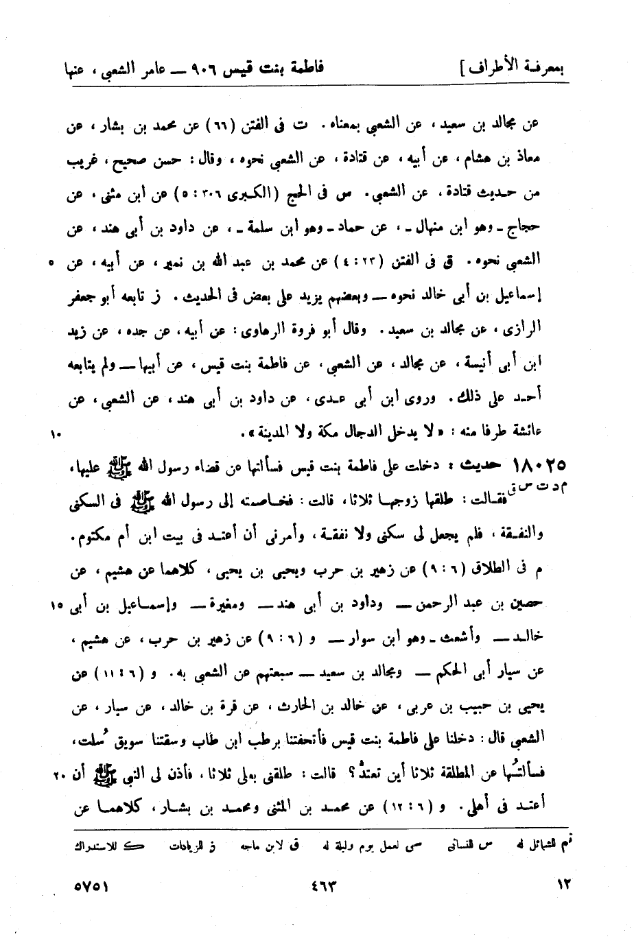 18025 -[م د ت س ق] حديث: دخلت على فاطمة بنت قيس فسألتها عن قضاء رسول الله صَلَّى اللَّهُ عَلَيْهِ وَسَلَّمَ عليها، فقالت: طلقها زوجها ثلاثاً، قالت: فخاصمته إلى رسول الله صَلَّى اللَّهُ عَلَيْهِ وَسَلَّمَ في السكنى والنفقة، فلم يجعل لى سكنى ولا نفقة، وأمرني أن أعتد في بيت ابن أم مكتوم. م في الطلاق (6: 9) عن زهير بن حرب ويحيى بن يحيى، كلاهما عن هشيم، عن حصين بن عبد الرحمن - وداود بن أبي هند - ومغيرة - وإسماعيل بن أبي خالد - وأشعث - وهو ابن سوار - و (6: 9) عن زهير بن حرب، عن هشيم، عن سيار أبي الحكم - ومجالد بن سعيد - سبعتهم عن الشعبي به. و (6: 11) عن يحيى بن حبيب بن عربي، عن خالد بن الحارث، عن قرة بن خالد، عن سيار، عن الشعبي قال: دخلنا على فاطمة بنت قيس فأتحفتنا برطب ابن طاب وسقتنا سويق سُلت، فسألتُها عن المطلقة ثلاثاً أين تعتدُّ؟ قالت: طلقني بعلي ثلاثاً، فأذن لي النبي صَلَّى اللَّهُ عَلَيْهِ وَسَلَّمَ أن أعتد في أهلي. و (6: 12) عن محمد بن المثنى ومحمد بن بشار، كلاهما عن -[464]- عبد الرحمن بن مهدي، عن سفيان، عن سلمة بن كهيل، عن الشعبي، عن فاطمة بنت قيس عن النبي صَلَّى اللَّهُ عَلَيْهِ وَسَلَّمَ في المطلقة ثلاثاً: ليس لها سكنى ولا نفقة. و (6: 13) عن إسحاق بن إبراهيم، عن يحيى بن آدم، عن عمار بن رزيق، عن أبي إسحاق، عن الشعبي، عن فاطمة بنت قيس، قالت: طلقني زوجي ثلاثاً فأتيت النبي صَلَّى اللَّهُ عَلَيْهِ وَسَلَّمَ فقال: انتقلي إلى بيت ابن عمك - عمرو بن أم مكتوم - فاعتدِّي عنده. و (6: 14) عن محمد بن عمرو بن جبلة، عن أبي أحمد الزبيري، عن عمار بن رزيق، عن أبي إسحاق، قال: كنت مع الأسود بن يزيد جالساً في المسجد الأعظم ومعنا الشعبي، فحدث الشعبي بحديث فاطمة بنت قيس أن رسول الله صَلَّى اللَّهُ عَلَيْهِ وَسَلَّمَ لم يجعل لها سكنى ولا نفقة، فأخذ الأسود كفاً من حصىً فحصبه به، وقال: ويلك، تحدث بهذا! قال عمر: لا نترك كتاب الله وسنة نبينا (صَلَّى اللَّهُ عَلَيْهِ وَسَلَّمَ) لقول امرأة، لا ندري لعلها حفظت أو نسيت، قال الله تعالى: لاَ تخرِجُوهُنَّ من بُيُوتِهنَّ وَلاَ يَخرُجنَ إلا أن يأتين بفاحشة مبينة (- 65: 1 -) . و (6: 15) عن أحمد بن عبدة الضبي، عن أبي داود الطيالسي، عن سليمان بن معاذ، عن أبي إسحاق نحوه - بقصته. د فيه (الطلاق 40: 1) عن نصر بن علي، عن أبي أحمد الزبيري نحوه - وفيه حديث عمرو، عن محمد بن كثير، عن سفيان به - مختصراً: أن زوجها طلقها ثلاثاً فلم يجعل لها النبي صَلَّى اللَّهُ عَلَيْهِ وَسَلَّمَ سكنى ولا نفقة. ت في النكاح (لا، بل في الطلاق 5: 2) عن أحمد بن منيع، عن هشيم، عن حصين وإسماعيل ومجالد وداود، أربعتهم عن الشعبي نحوه. و (5: 1) عن هناد، عن جرير، عن مغيرة نحوه، وزاد: قال فذكرته لإبراهيم فقال: قال عمر: لا ندع كتاب الله وسنة نبينا (صَلَّى اللَّهُ عَلَيْهِ وَسَلَّمَ) ... الحديث، وقال: حسن. س في الطلاق (الكبرى 70: 4) عن يعقوب بن ماهان، عن هشيم، عن سيار وحصين ومغيرة وداود وإسماعيل وذكر آخرين، كلهم عن الشعبي نحوه. و (70: 5) عن أبي بكر بن إسحاق، -[465]- عن أبي الجواب - وهو الأحوص بن جواب -، عن عمار بن رزيق نحوه. و (المجتبى 7: 3) عن محمد بن بشار به - مختصراً مثل حديث محمد بن كثير. و (7: 2) عن أحمد بن يحيى، عن أبي نعيم، عن سعيد بن يزيد الأحمسي، عن الشعبي - نحو الأول. ق فيه (الطلاق 10: 2) عن أبي بكر بن أبي شيبة، عن جرير به. و (4) عن محمد بن رمح، عن الليث بن سعد، عن إسحاق بن أبي فروة، عن أبي الزناد، عن الشعبي، قال: قلت لفاطمة بنت قيس: حدثيني عن طلاقك، قالت: طلقني زوجي ثلاثاً - وهو خارج إلى اليمن - فأجاز ذلك رسول الله صَلَّى اللَّهُ عَلَيْهِ وَسَلَّمَ.