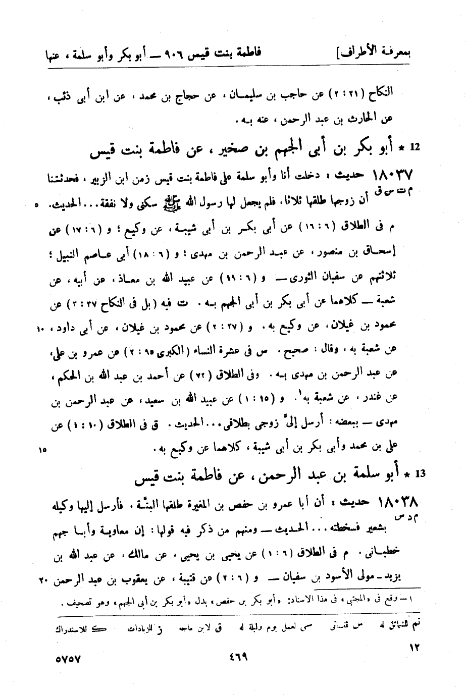 18037 -[م ت س ق] حديث: دخلت أنا وأبو سلمة على فاطمة بنت قيس زمن ابن الزبير، فحدثتنا أن زوجها طلقها ثلاثاً، فلم يجعل لها رسول الله صَلَّى اللَّهُ عَلَيْهِ وَسَلَّمَ سكنى ولا نفقة ... الحديث. م في الطلاق (6: 16) عن أبي بكر بن أبي شيبة، عن وكيع؛ و (6: 17) عن إسحاق بن منصور، عن عبد الرحمن بن مهدي؛ و (6: 18) أبي عاصم النبيل، ثلاثتهم عن سفيان الثوري - و (6: 19) عن عبيد الله بن معاذ، عن أبيه، عن شعبة - كلاهما عن أبي بكر بن أبي الجهم به. ت فيه (بل في النكاح 37: 3) عن محمود بن غيلان، عن وكيع به. و (37: 2) عن محمود بن غيلان، عن أبي داود، عن شعبة به، وقال: صحيح. س في عشرة النساء (الكبرى 95: 2) عن عمرو بن علي، عن عبد الرحمن بن مهدي به. وفي الطلاق (72) عن أحمد بن عبد الله بن الحكم، عن غندر، عن شعبة به1. و (15: 1) عن عبيد الله بن سعيد، عن عبد الرحمن بن مهدي - ببعضه: أرسل إليَّ زوجي بطلاقي ... الحديث. ق في الطلاق (10: 1) عن علي بن محمد وأبي بكر بن أبي شيبة، كلاهما عن وكيع به.