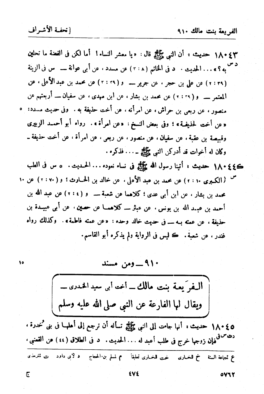 18045 -[د ت س ق] حديث: أنها جاءت إلى النبي صَلَّى اللَّهُ عَلَيْهِ وَسَلَّمَ تسأله أن ترجع إلى أهلها في بني خُدرة، فإن زوجها خرج في طلب أعبد له ... الحديث. د في الطلاق (44) عن القعنبي، -[475]- عن مالك، عن سعد بن إسحاق بن كعب بن عجرة، عن عمته زينب بنت كعب أن الفريعة أخبرتها به. ت فيه (الطلاق 23: 1) عن إسحاق بن موسى، عن معن، عن مالك به. و (23: 2) عن ابن بشار، عن يحيى بن سعيد، عن سعد بن إسحاق نحوه، وقال: حسن صحيح. س فيه (الطلاق 60: 1) عن أبي كريب، عن ابن إدريس، عن شعبة وابن جريج ويحيى بن سعيد - وهو الأنصاري - ومحمد بن إسحاق، أربعتهم عن سعد بن إسحاق، عن زينب، عن الفارعة نحوه. و (60: 3) عن قتيبة، عن حماد بن زيد - و (62) عن إسحاق بن منصور، عن ابن مهدي، عن سفيان - كلاهما عن سعد بن إسحاق، عن عمته زينب، عن فريعة نحوه. و (60: 2) عن قتيبة، عن الليث، عن يزيد بن أبي حبيب، عن يزيد بن محمد، عن سعد بن إسحاق نحوه. وفي التفسير (في الكبرى) عن محمد بن سلمة، عن ابن القاسم، عن مالك به. ق في الطلاق (8) عن أبي بكر بن أبي شيبة، عن أبي خالد الأحمر، عن سعد بن إسحاق به. ز لم يقل الفارعة إلا أبو كريب وحده.