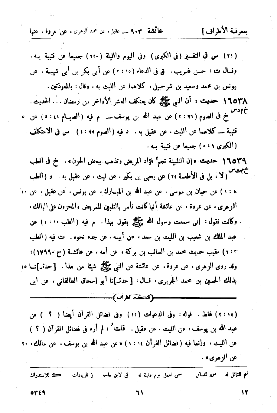 ت فيه (الطب 3: 2) عقيب حديث محمد بن السائب بن بركة، عن أمه، عن عائشة (ح 17990) : وقد روى الزهري، عن عروة، عن عائشة عن النبي صَلَّى اللَّهُ عَلَيْهِ وَسَلَّمَ شيئا من هذا. [حدث] نا بذلك الحسين بن محمد الجريري، قال: [حدث] نا أبو إسحاق الطلقاني، عن ابن -[62]- المبارك، عن يونس، عن الزهري بمعناه. [حدثنا] بذلك أبو إسحاق الطالقاني. (ز) كذا في نسخ السماع، وليس فيه عقيل. وفي بعض النسخ: وقد رواه ابن المبارك، عن يونس، عن الزهري، عن عروة، عن عائشة عن النبيّ صَلَّى اللَّهُ عَلَيْهِ وَسَلَّمَ. [حدثنا] بذلك أبو إسحاق الطالقاني، قال: [حدثنا] ابن المبارك.. فذكره - ولم يذكر الحسين بن محمد الجريري.