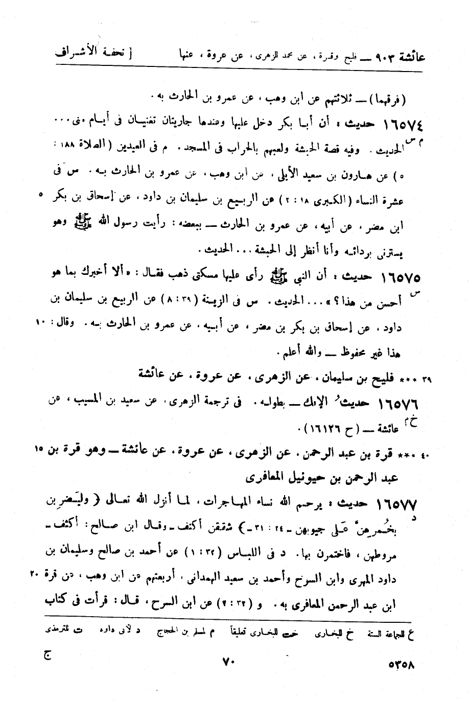 س في عشرة النساء (الكبرى 8: 2) عن الربيع بن سليمان بن داود، عن إسحاق بن بكر بن مضر، عن أبيه، عن عمرو بن الحارث - ببعضه: رأيت رسول الله صَلَّى اللَّهُ عَلَيْهِ وَسَلَّمَ وهو يسترني بردائه وأنا أنظر إلى الحبشة ... الحديث.