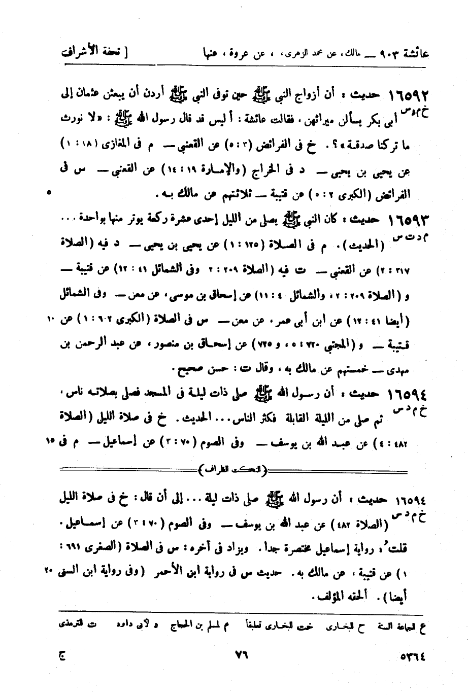 ت فيه (الصلاة 209: 2 وفي الشمائل 41: 12) عن قتيبة - و (الصلاة 209: 2، والشمائل 4: 11) عن إسحاق بن موسى، عن معن - وفي الشمائل (أيضاً 41: 12) عن ابن أبي عمر، عن معن -