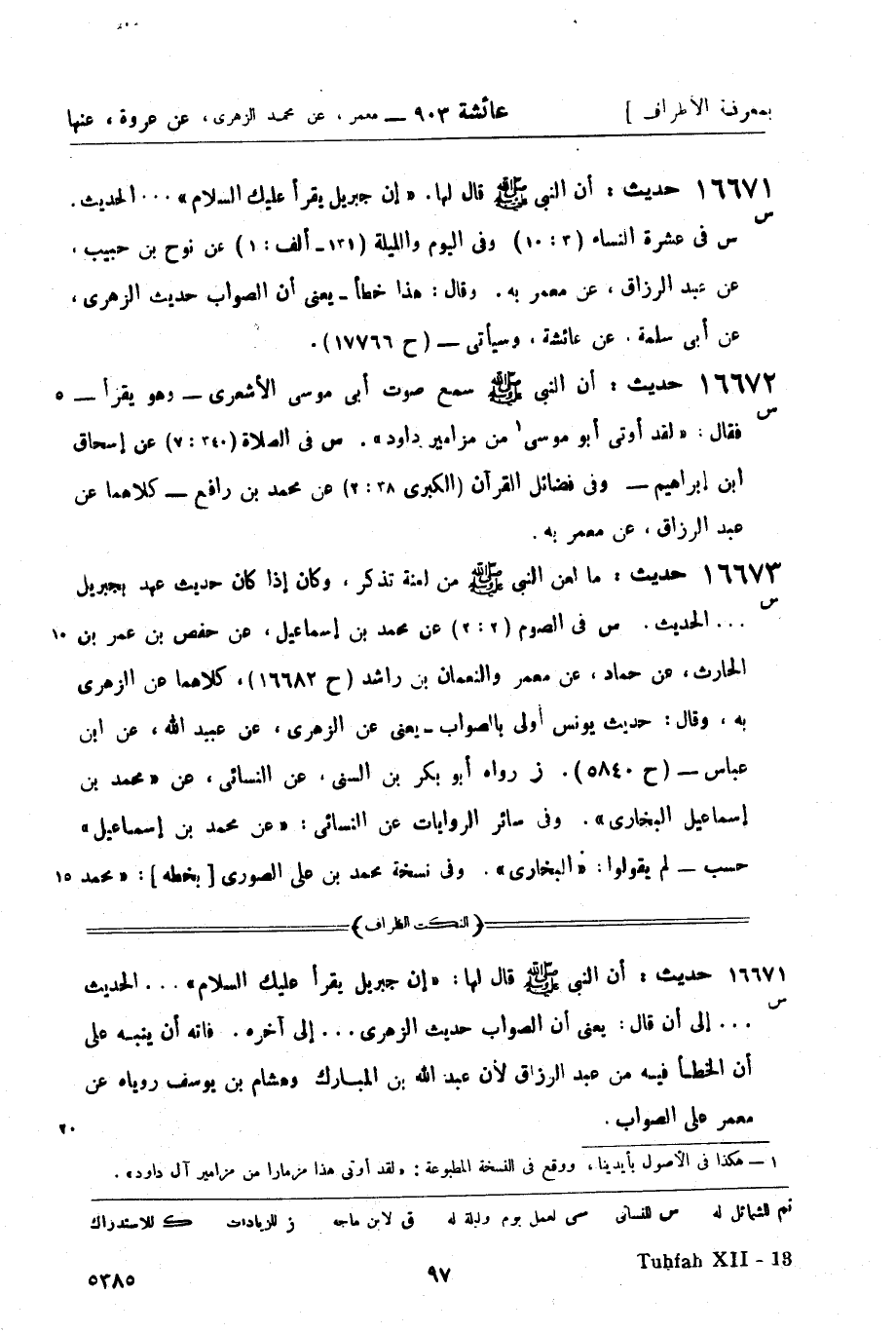 س في عشرة النساء (3: 10) وفي اليوم والليلة (131 - ألف: 1) عن نوح بن حبيب، عن عبد الرزاق، عن معمر به. وقال: هذا خطأ - يعني أن الصواب حديث الزهري، عن أبي سلمة، عن عائشة، وسيأتي - (ح 17766) .