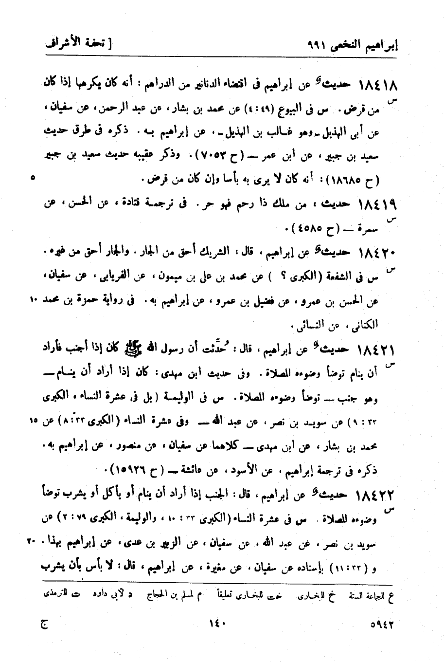 18421 -[س] حديث عن إبراهيم، قال: حدثت أن رسول الله صَلَّى اللَّهُ عَلَيْهِ وَسَلَّمَ كان إذا أجنب فأراد أن ينام توضأ وضوءه للصلاة. وفي حديث ابن مهدي: كان إذا أراد أن ينام - وهو جنب - توضأ وضوءه للصلاة. (س) في الوليمة (بل في عشرة النساء، الكبرى 33: 9) عن سويد بن نصر، عن عبد الله - وفي عشرة النساء (الكبرى 33: 8) عن محمد بن بشار، عن ابن مهدي - كلاهما عن سفيان، عن منصور، عن إبراهيم به. ذكره في ترجمة إبراهيم، عن الأسود، عن عائشة - (ح 15926) .