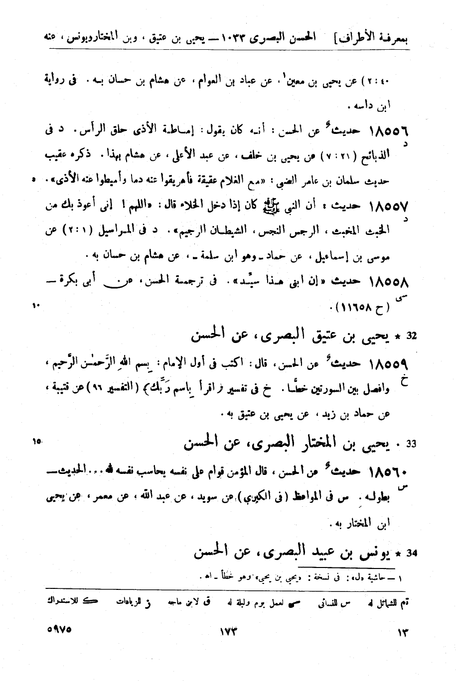 18559 -[خ] حديث عن الحسن، قال: اكتب في أول الإمام: بسم الله الرحمن الرحيم، وافصل بين السورتين خطا. (خ) في تفسير اقرأ باسم ربك (التفسير 96) عن قتيبة، عن حماد بن زيد، عن يحيى بن عتيق به.