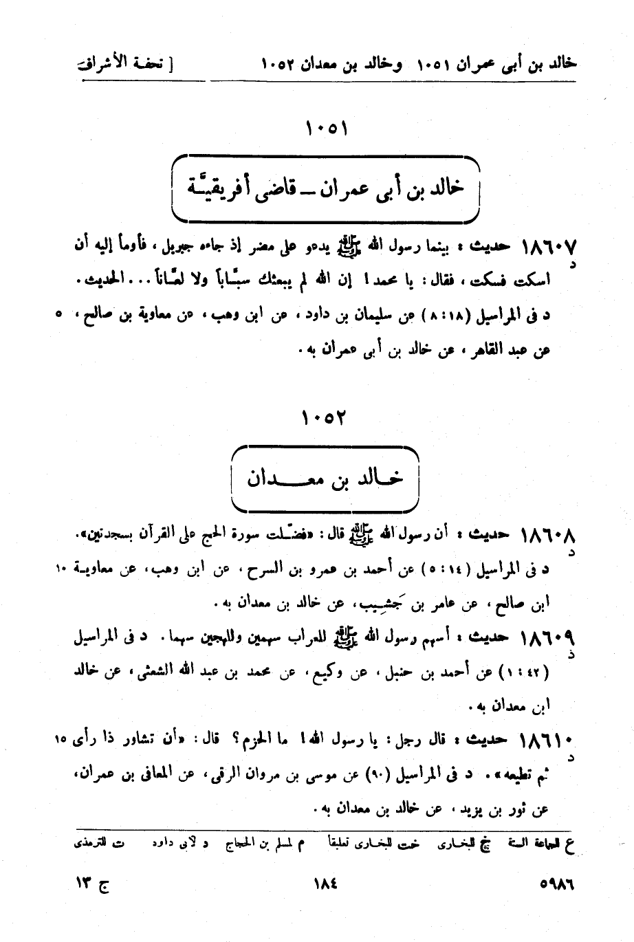 18608 -[د] حديث: أن رسول الله صَلَّى اللَّهُ عَلَيْهِ وَسَلَّمَ قال فضلت سورة الحج على القرآن بسجدتين. (د) في المراسيل (14: 5) عن أحمد بن عمرو بن السرح، عن ابن وهب، عن معاوية بن صالح، عن عامر بن جشيب، عن خالد بن معدان به.