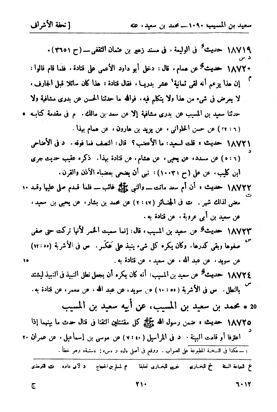 18720 -[م] حديث عن همام، قال: دخل أبو داود الأعمى على قتادة، فلما قام قالوا: إن هذا يزعم أنه لقى ثمانية1 عشر بدريا، فقال قتادة: هذا كان سائلا قبل الجارف، لا يعرض في شيء من هذا ولا يتكلم فيه، فوالله ما حدثنا الحسن عن بدري مشافهة ولا حدثنا سعيد بن المسيب عن بدري مشافهة إلا عن سعد بن مالك. (م) في مقدمة كتابه (6: 32) عن حسن الحلواني، عن يزيد بن هارون، عن همام بهذا.